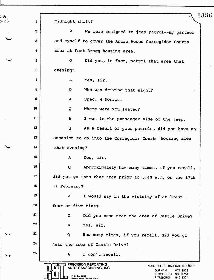 A We were assigned to jeep patrol -- my partner and myself to cover the Anzio Acres Corregidor Courts area at Fort Bragg housing area.