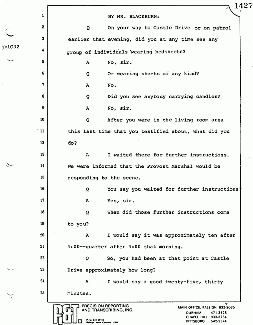 Q On your way to Castle Drive or on patrol earlier that evening, did you at any time see any group of individuals wearing bedsheets?