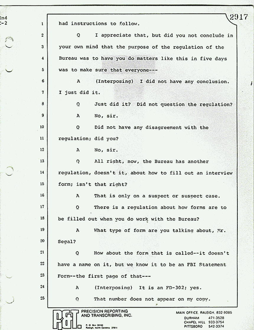 A At that time, the policy of the FBI was to dictate the notes within five working days. These were done within seven, so I would have to say that I dictated them either on the 19th or the 20th -- three days afterwards. I sent the transcript (sic) to our office in Charlotte. They were transcribed on the 24th.