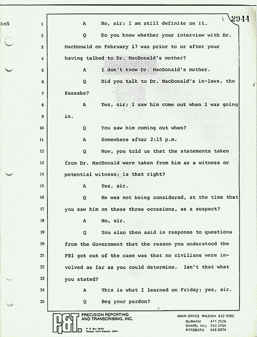 Q Do you know whether your interview with Dr. MacDonald on February 17 was prior to or after your having talked to Dr. MacDonald's mother?