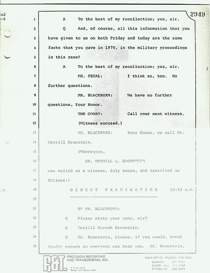 Q Mr. Caverly, on Friday, you told us what Dr. MacDonald said according to your recollection in the first of your three interviews that you had with him back in 1970; am I correct in that regard?