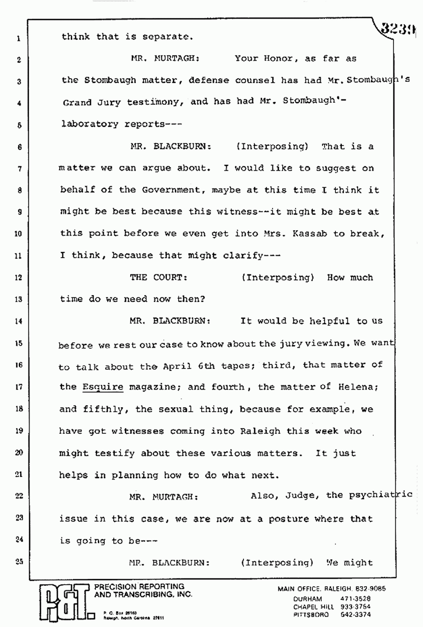 MR. BLACKBURN: It would be helpful to us before we rest our case to know about the jury viewing. We want to talk about the April 6th tapes; third, that mater of the Esquire magazine; and fourth, the matter of Helena; and fifthly, the sexual thing, because for example, we have got witnesses coming into Raleigh this week who might tetify about these various mattrs. It just helps in planning how to do what next.