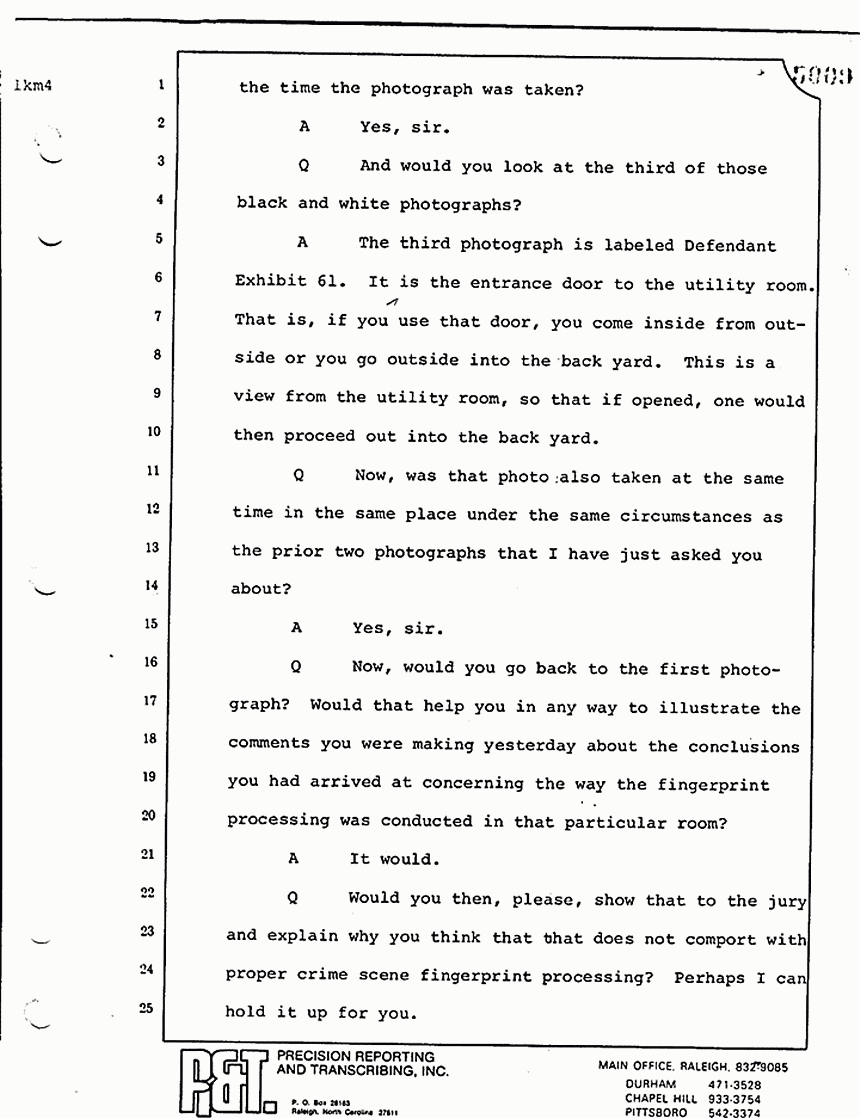 Q Now, would you go back to the first photograph? Would that help you in any way to illustrate the comments you were making yesterday about the conclusions you had arrived at concerning the way the fingerprint processing was conducted in that particular room?