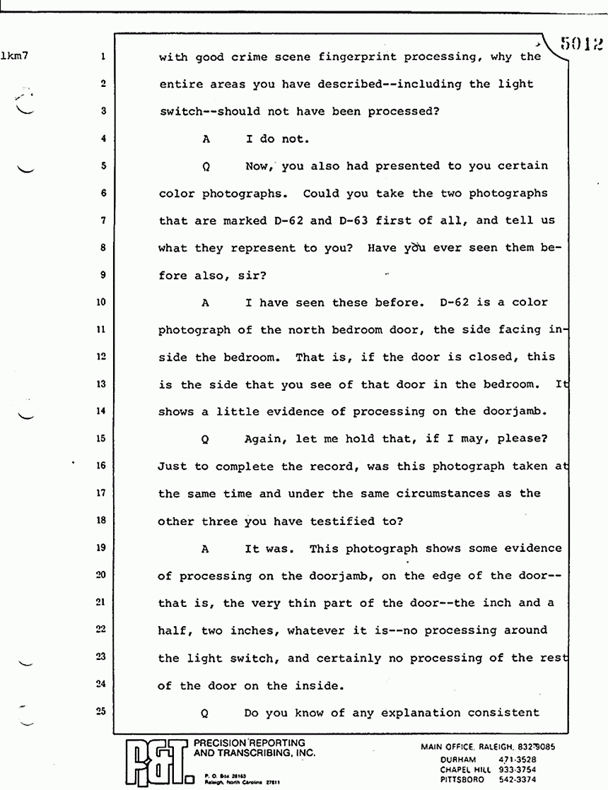 Q Do you know of any explanation consistent with good crime scene fingerprint processing why the entire door and the light switch should not have been processed?