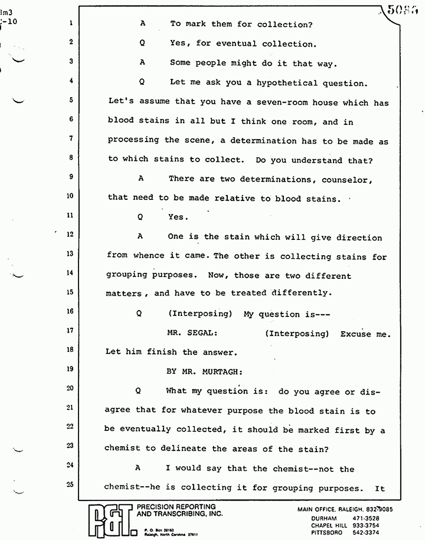 THE WITNESS: We have two competing -- as counselor, Mr. Murtagh said -- demands: you want to get fingerprint evidence as quickly as possible and you want to preserve the blood. Now, the question is, what is the blood being preserved for.