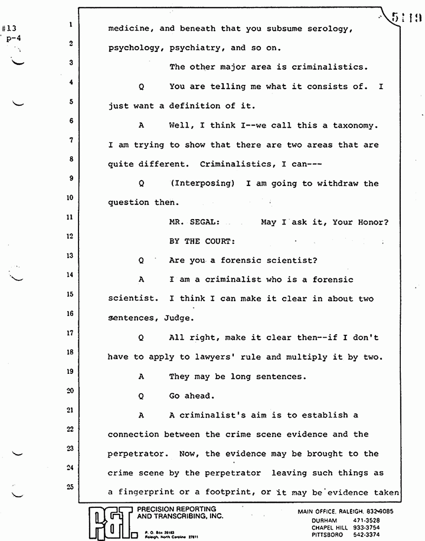 Q Professor, there was a Government witness who was asked the question as to what her definition of "forensic science" was. I didn't feel the answer was entirely adequate. Were you here?
