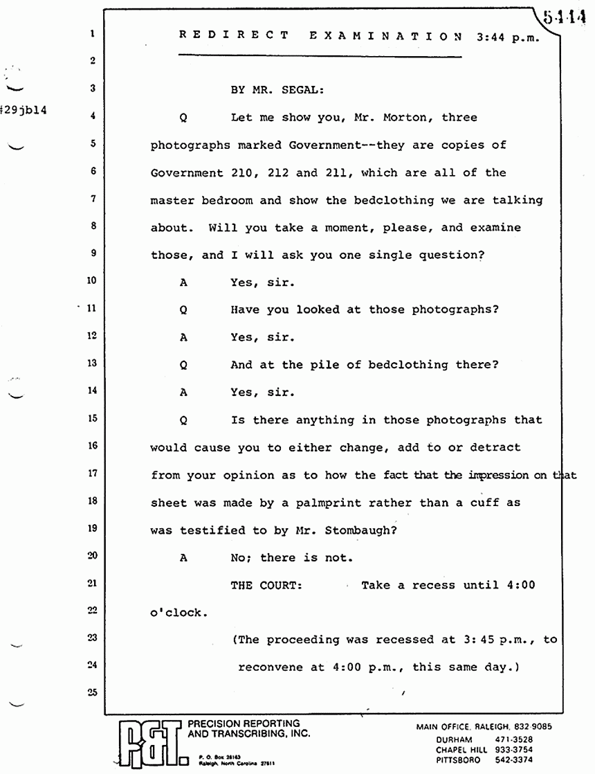 Q Let me show you, Mr. Morton, three photographs marked Government -- they are copies of Government 210, 212 and 211, which are all of the master bedroom and show the bedclothing we are talking about. Will you take a moment, please, and examine those, and I will ask you one single question?