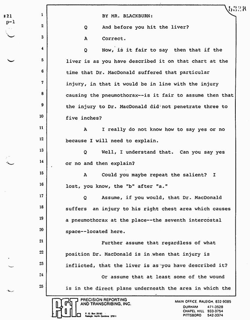 Q But it is quite possible, isn't it Dr. Podgorny, that Dr. MacDonald's liver was penetrated and there was just never any evidence that this occurred. Would this be correct?