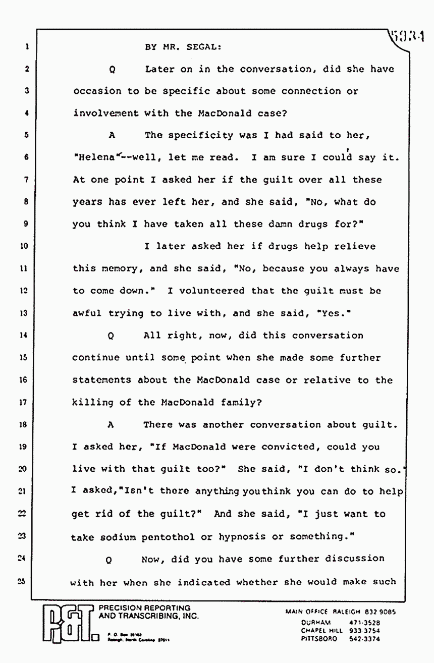 A There was another conversation about guilt. I asked her, "If MacDonald were convicted, could you live with that guilt too?" She said, "I don't think so." I asked, "Isn't there anything you think you can do to help get rid of the guilt?" And she said, "I just want to take sodium pentothol or hypnosis or something."