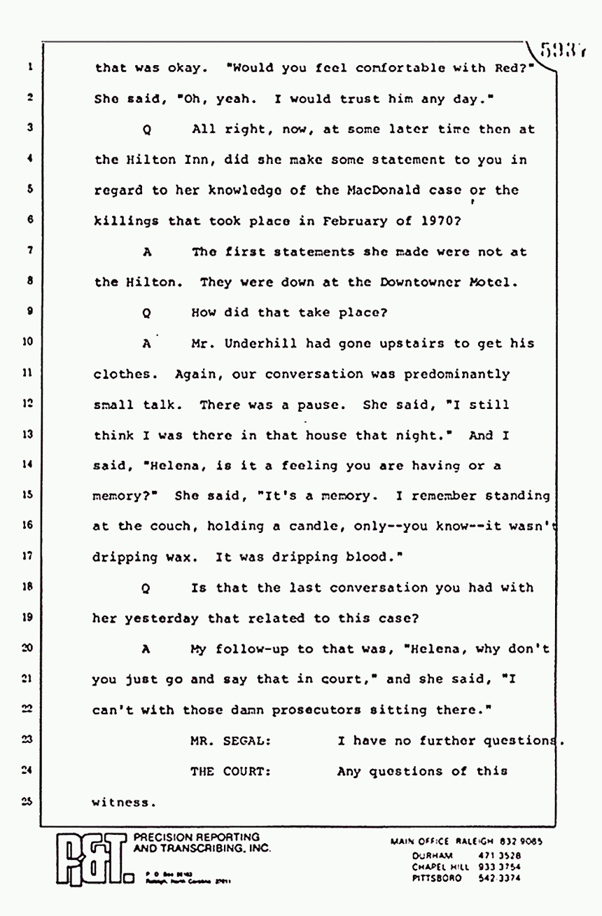 Q All right, now, did this conversation continue until some point when she made some further statements about the MacDonald case or relative to the killing of the MacDonald family?