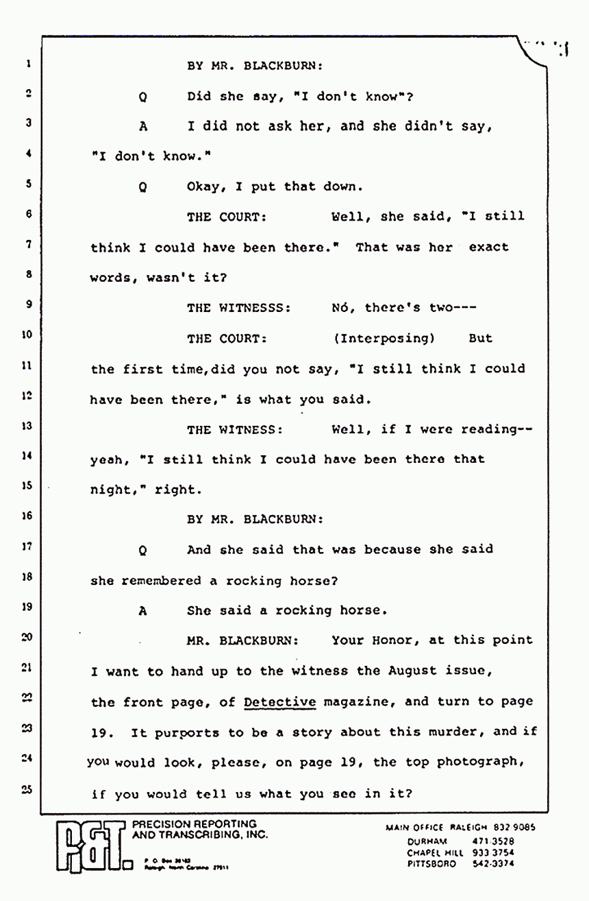 A After a pause, she said to me, "I still think I could have been there that night." I then asked, "What makes you think so?" She said, "I don't know." There was a pause, and then she said, "That rocking horse." There was another pause, and she added, "You know, Kristen, Kristen Jean. Those pictures, when I looked at those pictures, I knew I had seen her somewhere before." Another pause, and she added, "And that driveway, I remember being in that driveway."