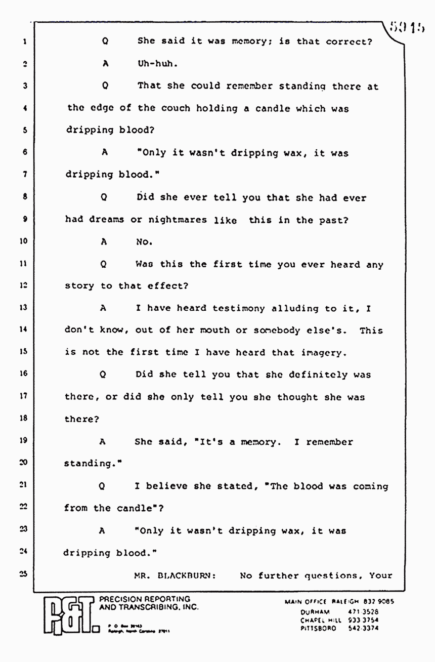 Q That she could remember standing there at the edge of the couch holding a candle which was dripping blood?