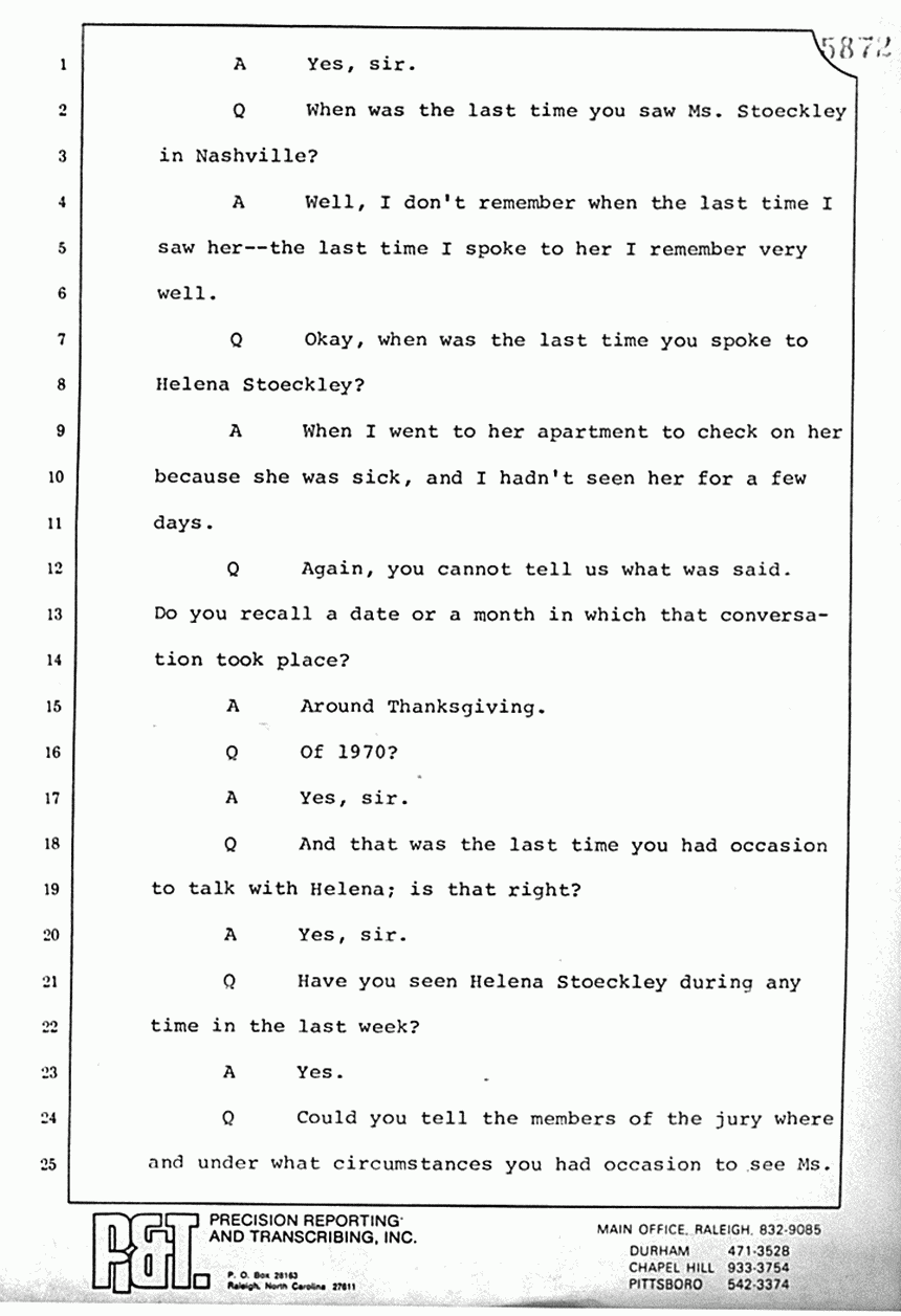 Q About what month, if you can pinpoint it, Mrs. Zillioux, did you hear from Helena Stoeckley the reasons for her leaving North Carolina?