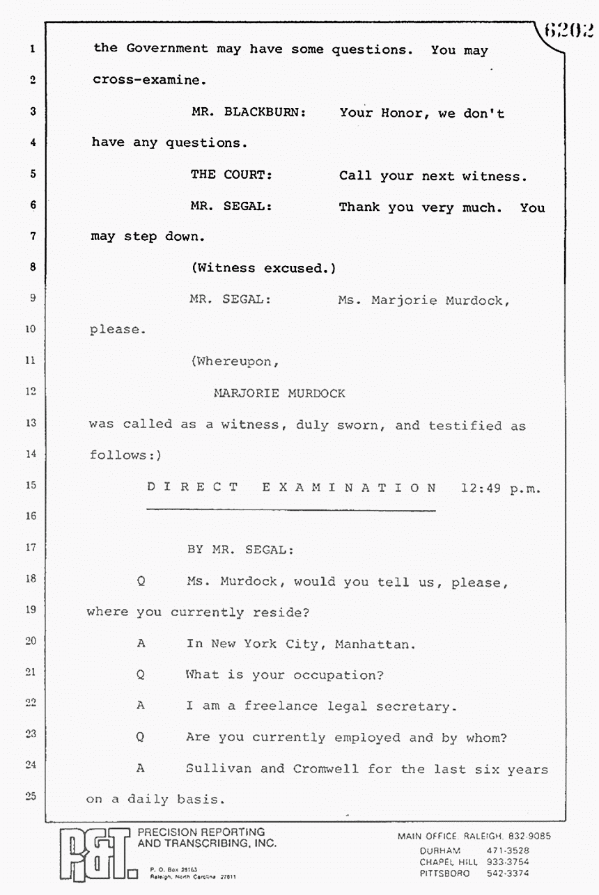 MR. SEGAL: Let me tell Your Honor that we had planned to use only today, unless there may be one person out of sequence -- to use all of our character witnesses today -- plus certain fact witnesses. You have heard Doctors McGann and Manson. There will be another major fact witness after lunch. You know, they are all around; but as I said, we plan to do it only today with the exception of a person who is to come in tonight, who will not be terribly long. I do want to stress we are trying to cover different periods of time in the life. I have been in many cases where the Government's argument is they didn't know at the right time. They can't tell from before. I think in fairness we are not belaboring the various periods of life. This next witness talks about the last seven and a half years of life of Dr. MacDonald's life. He has worked with him, close, in that regard. There will only be two or three at most who deal with both the personal and professional during that period of time. We will finish today on this, plus the facts. I don't think it is unreasonable in a case of this magnitude to let the Defendant do that. It is not going to burden us.