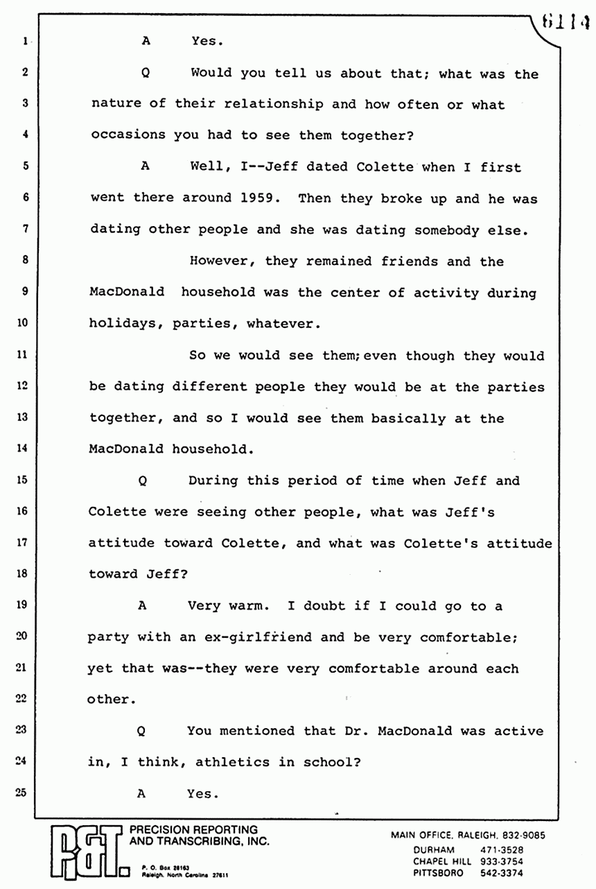 A Well, I -- Jeff dated Colette when I first went there around 1959. Then they broke up and he was dating other people and she was dating somebody else. However, they remained friends and the MacDonald household was the center of activity during holidays, parties, whatever. So we would see them;even though they would be dating different people they would be at the parties together, and so I would see them basically at the MacDonald household.