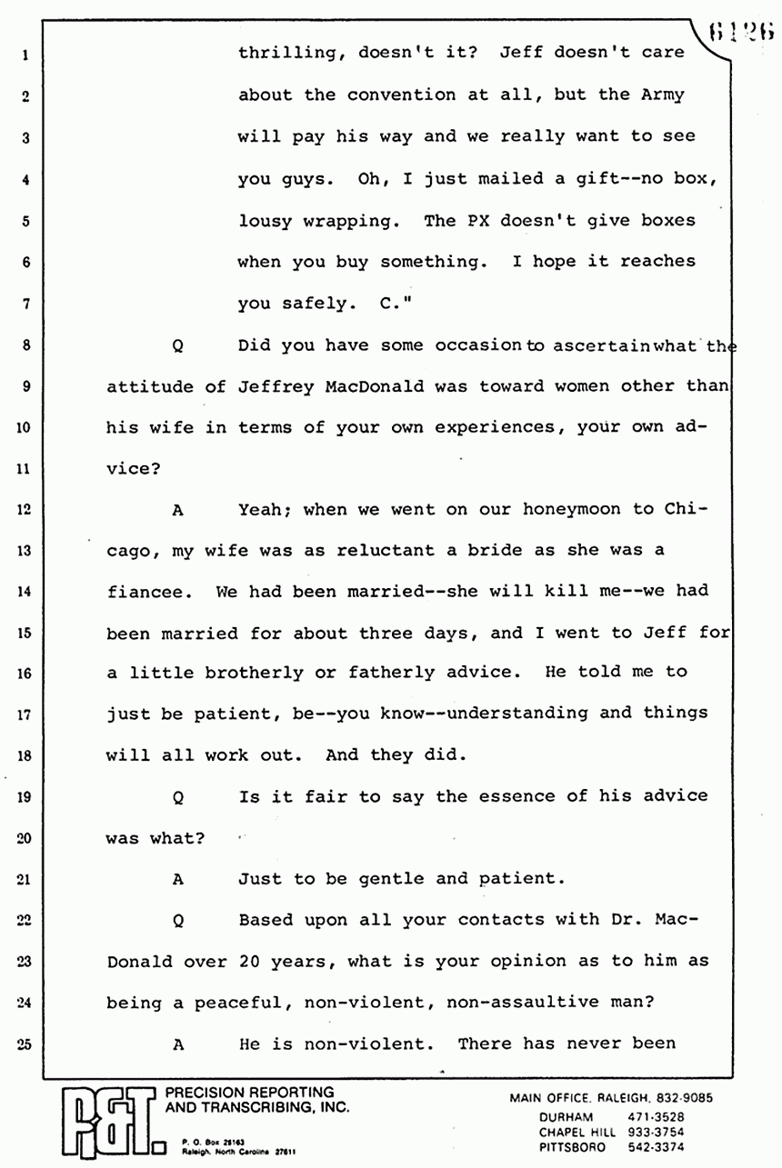Q Did you have some occasion to ascertain what the attitude of Jeffrey MacDonald was toward women other than his wife in terms of your own experiences, your own advice?