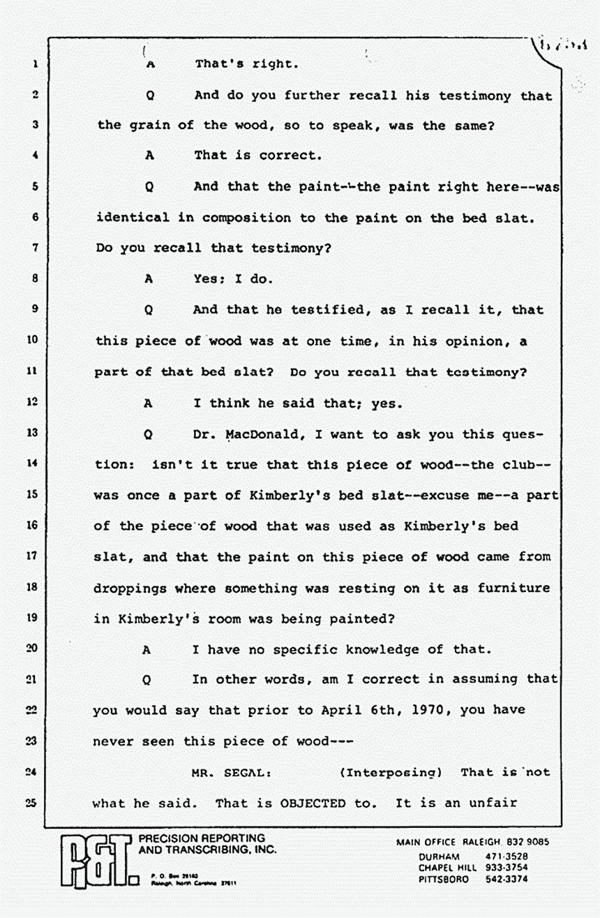 Q Dr. MacDonald, I want to ask you this question: isn't it true that this piece of wood -- the club -- was once a part of Kimberly's bed slat -- excuse me -- a part of the piece of wood that was used as Kimberly's bed slat, and that the paint on this piece of wood came from droppings where something was resting on it as furniture in Kimberly's room was being painted?