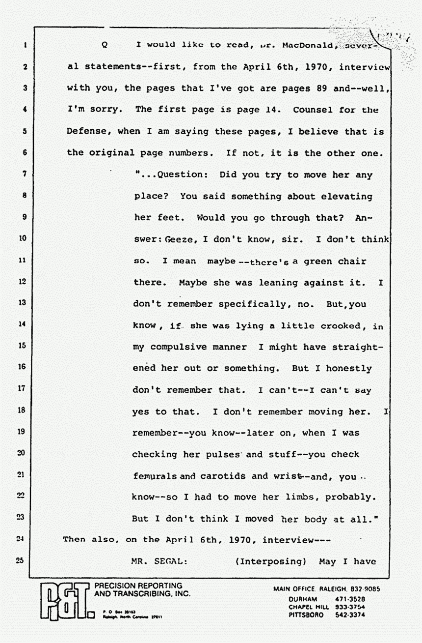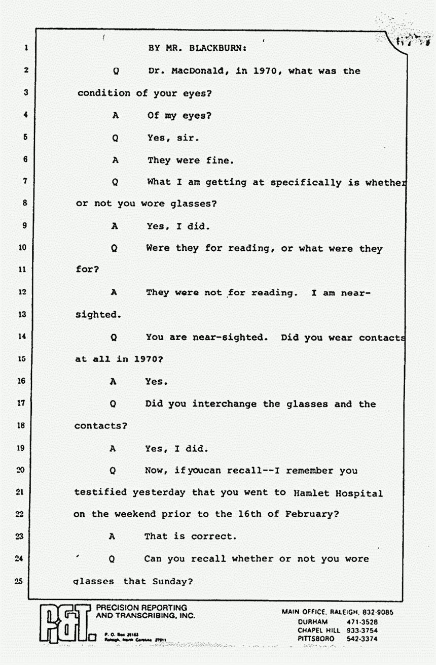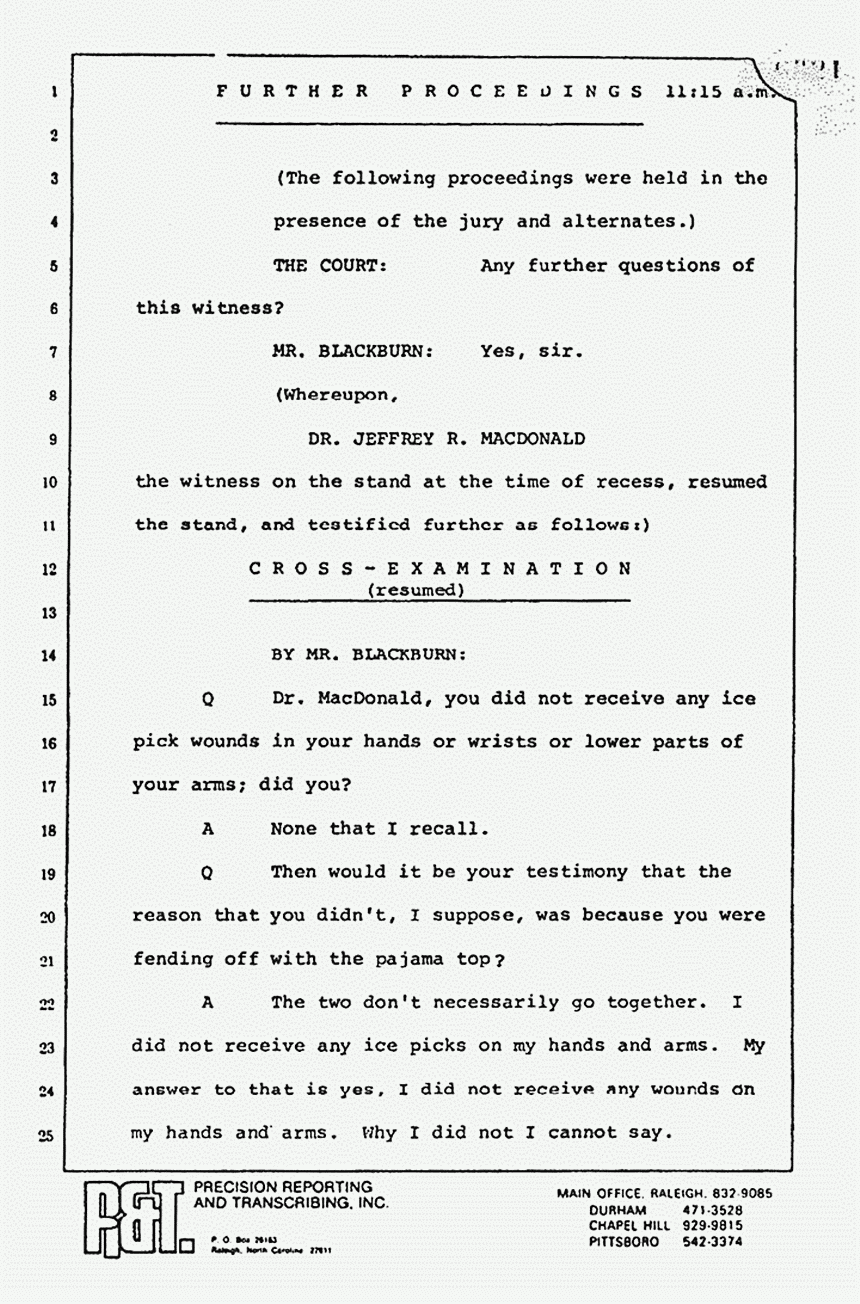(Whereupon, DR. JEFFREY R. MacDONALD, the witness on the stand at the time of recess, resumed the stand and testified further as follows:)