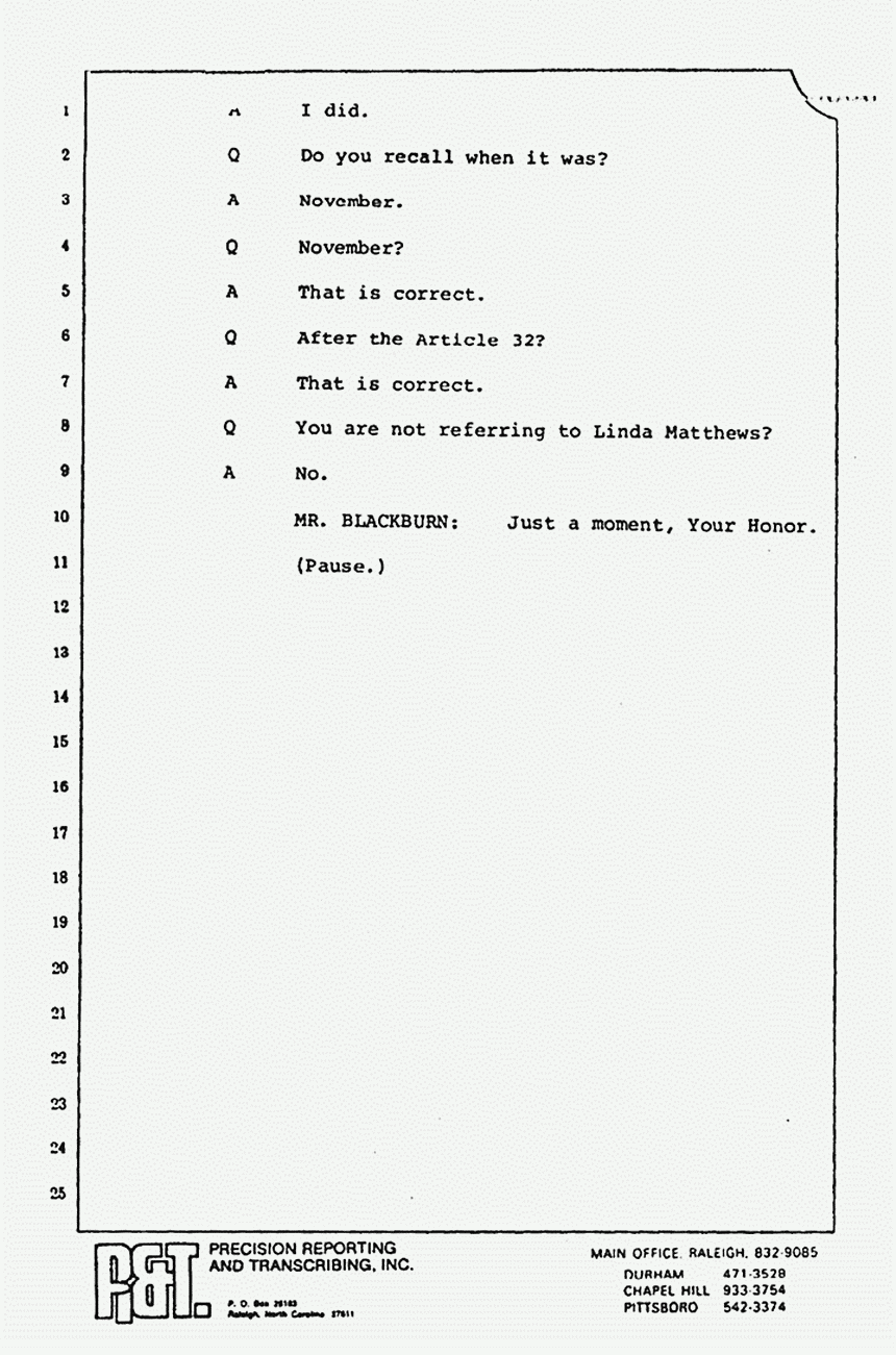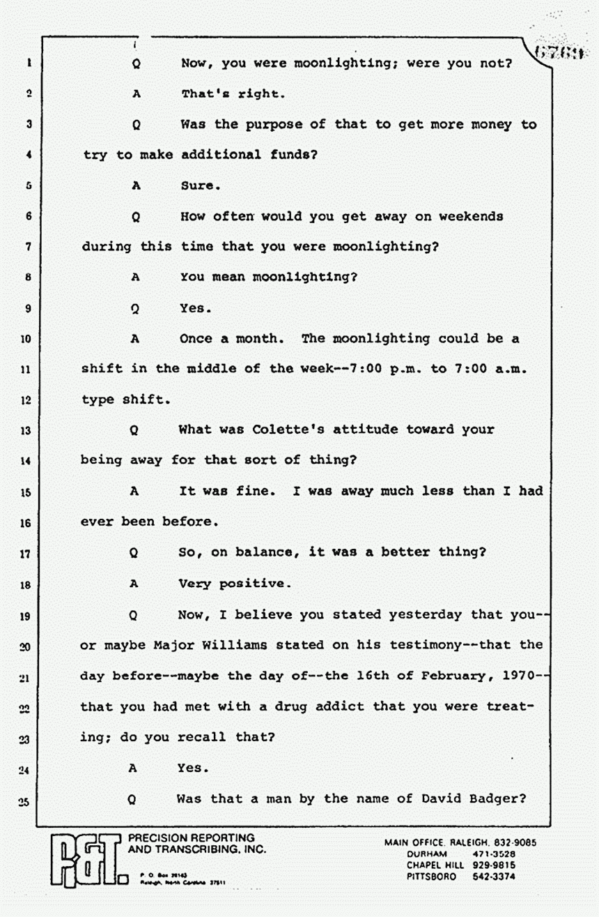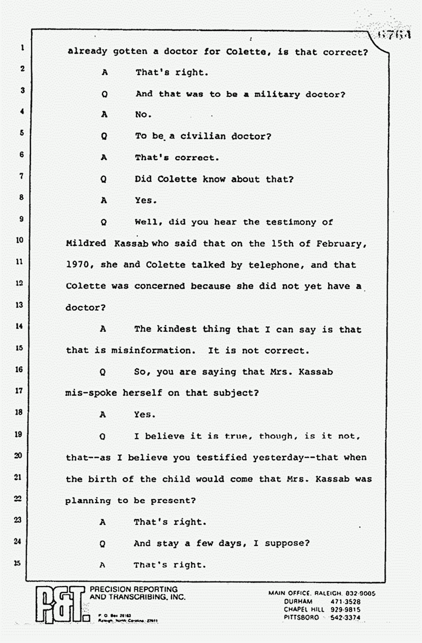 (Whereupon, DR. JEFFREY R. MacDONALD, the witness on the stand at the time of recess, resumed the stand and testified further as follows:)