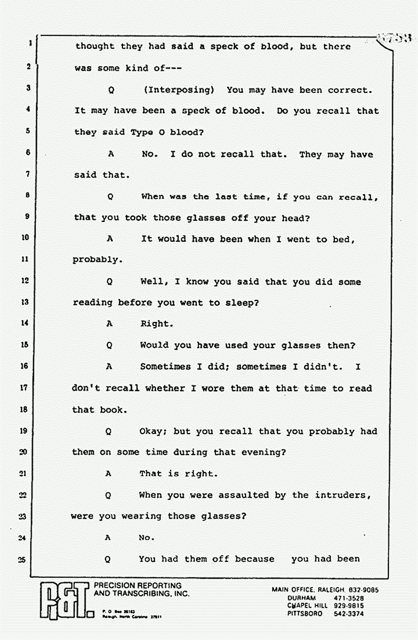 Q Do you recall the testimony of Mr. Bob Shaw and, I believe, Mr. Craig Chamberlain, who stated that they found the glasses in the living room on the floor, picked them up, found a spot of blood on the lens, took the blood off the lens, subsequently had that blood typed. And I believe it was consistent with Type O blood. Do you recall that testimony?