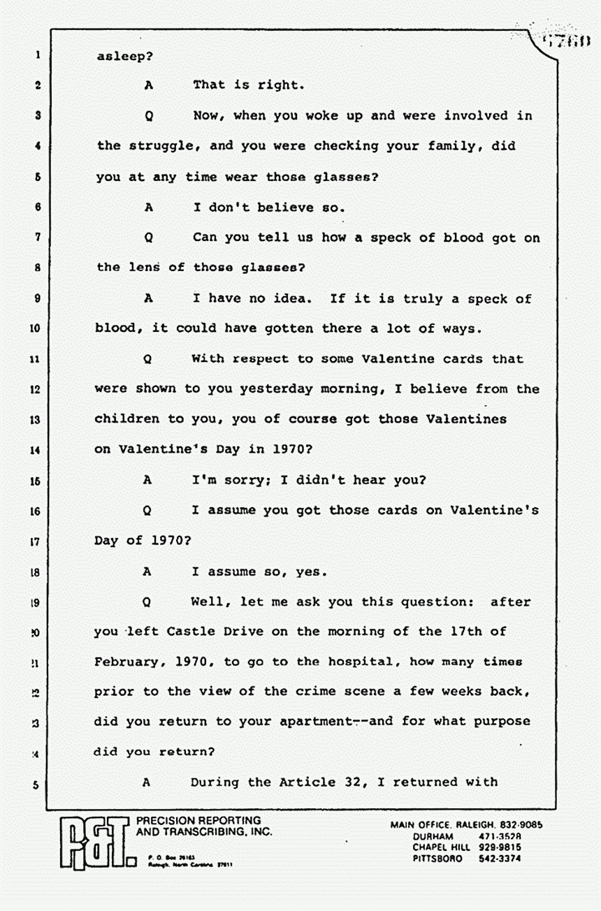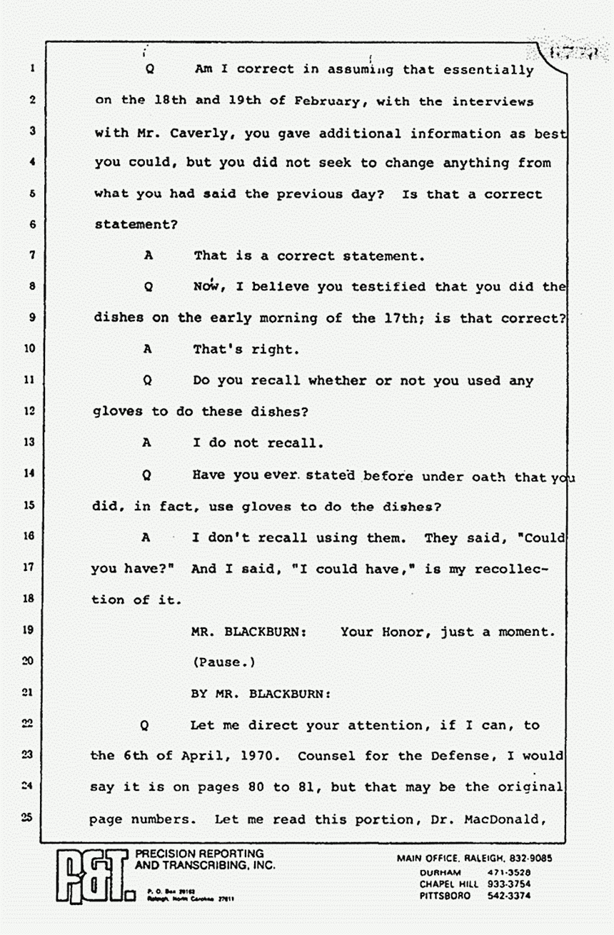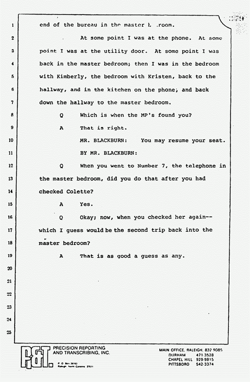 Q Dr. MacDonald, suppose the jury should find from the evidence that there is no blood or was no blood that was sufficient to be typed -- sufficient quantities to be typed -- on either the telephone in the master bedroom or the kitchen and that they should find from the evidence that you went there and used the phone as you have indicated; do you have any explanation for why there would be no blood?