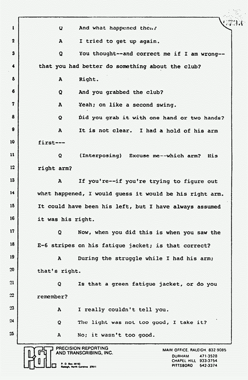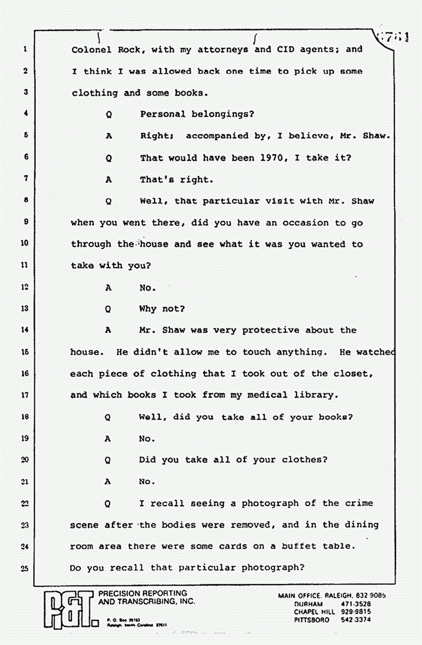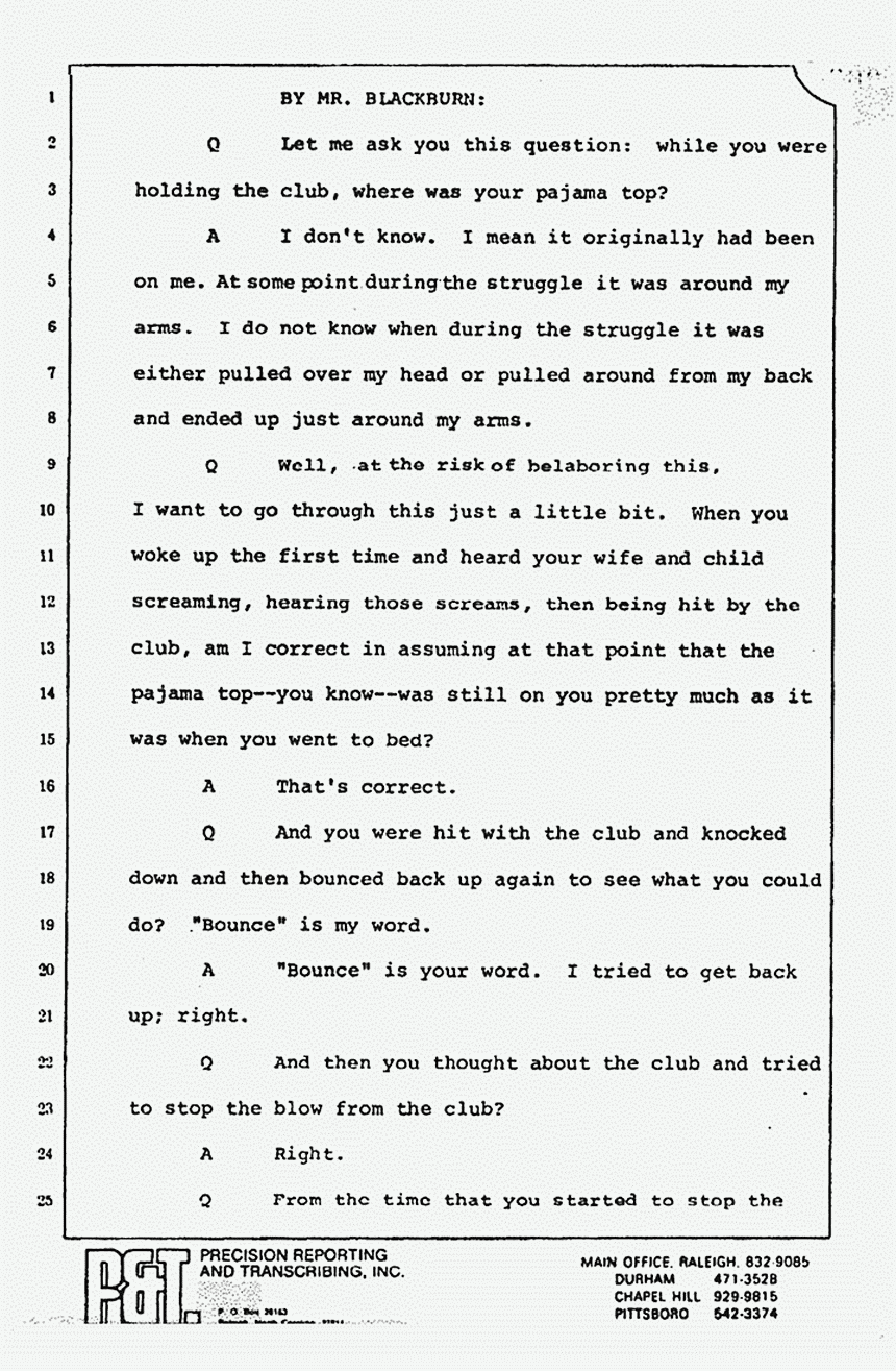Q Dr. MacDonald, late yesterday afternoon, right as we were getting ready to adjourn, Defense Counsel showed you four weapons -- a club, two knives and an ice pick -- and asked you whether or not you, of course, killed your family. What I would like to do now is to hand you once again the club, which is Government Exhibit 306, and ask you to take a look at it, sir, and tell us whether or not you know whether or not that club came from your house?
