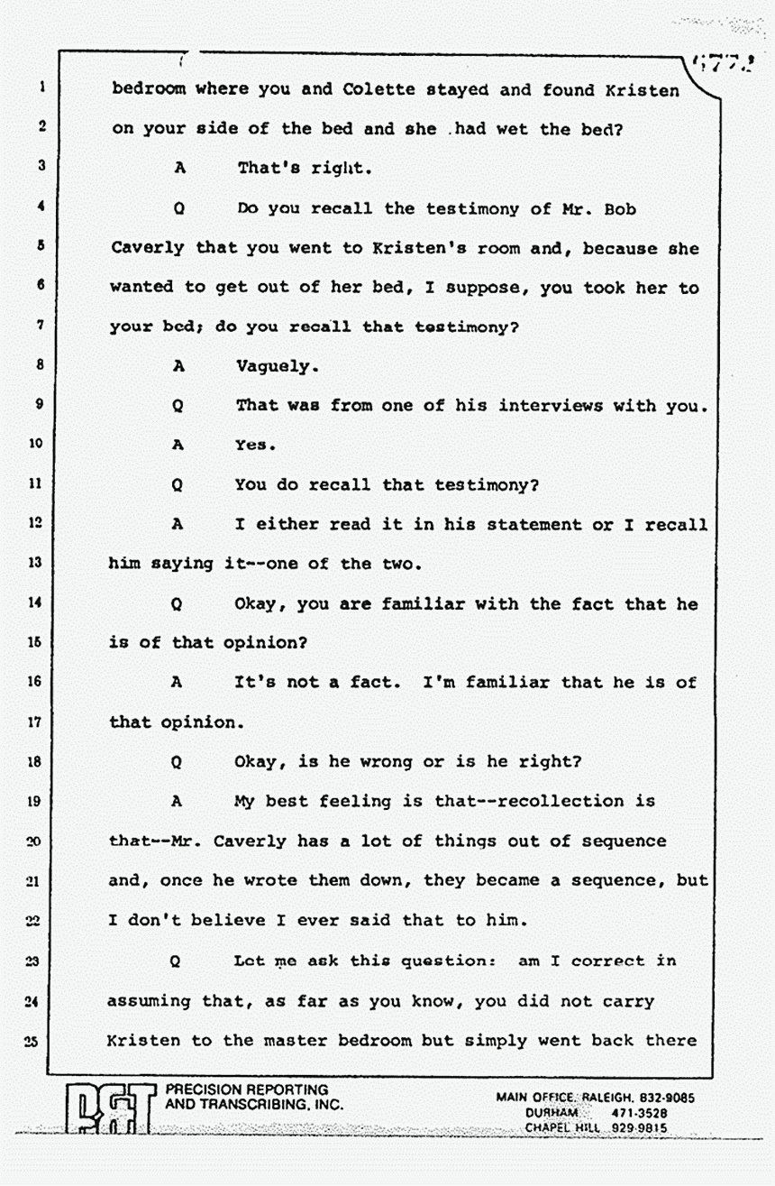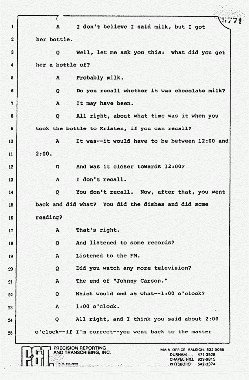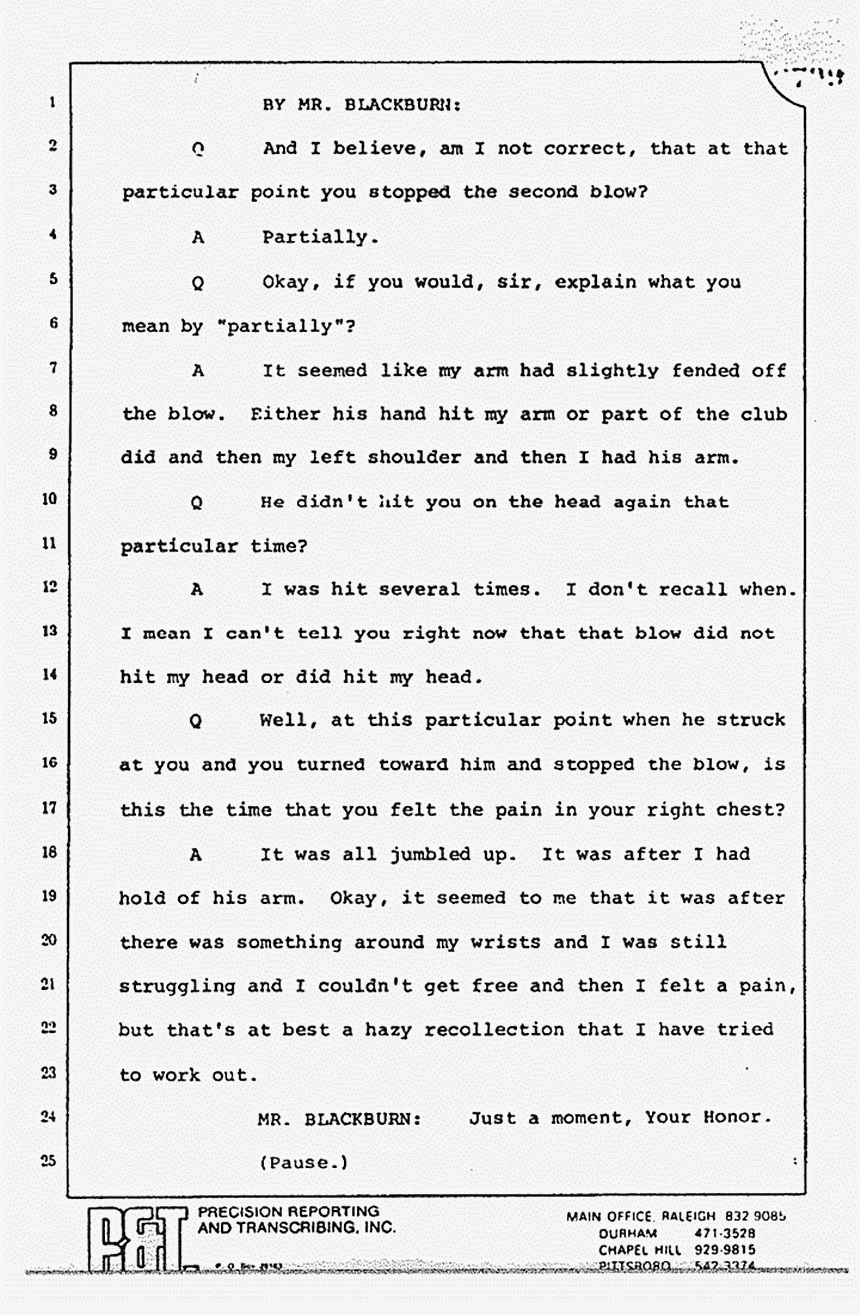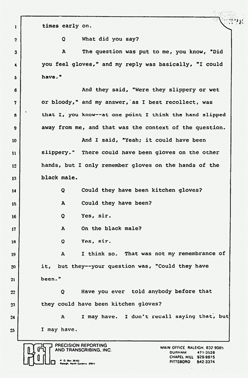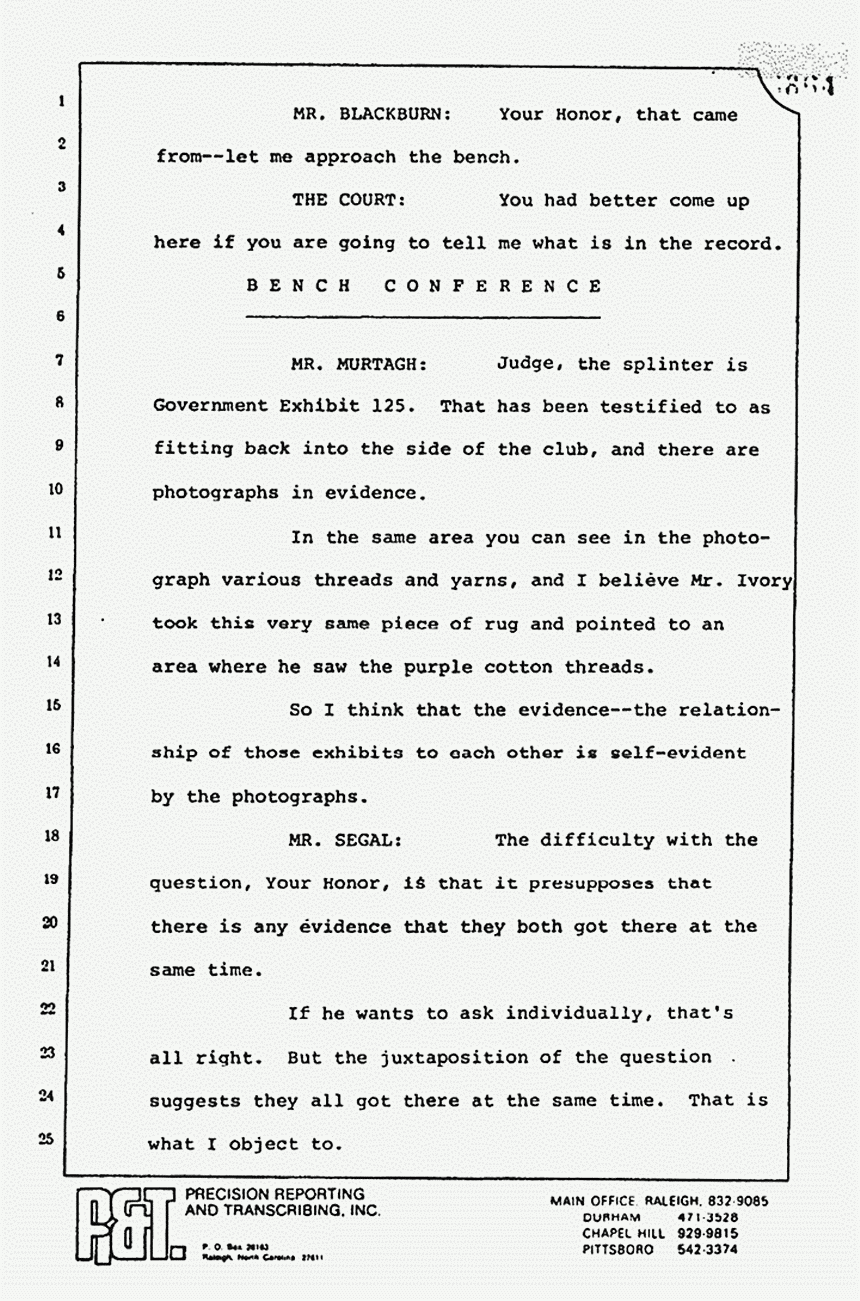 Q Now, earlier in the trial in the Government's case, there was testimony from Government witnesses -- specifically Mr. Hilyard Browning (sic) who stated, as I recall, that this club came from another piece of wood in your house -- that was recovered from your house -- that was a bed slat in Kimberly's bed. Do you recall that testimony?