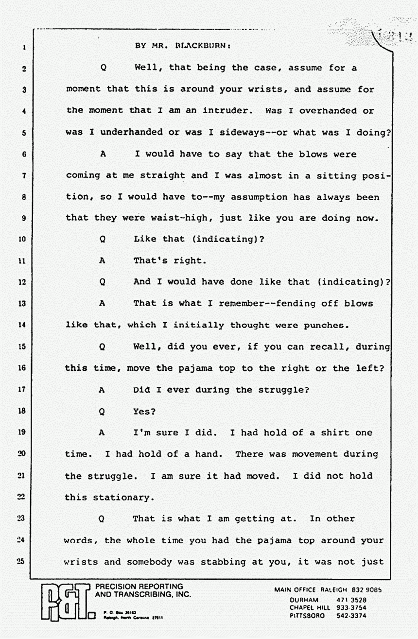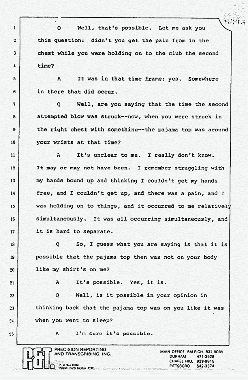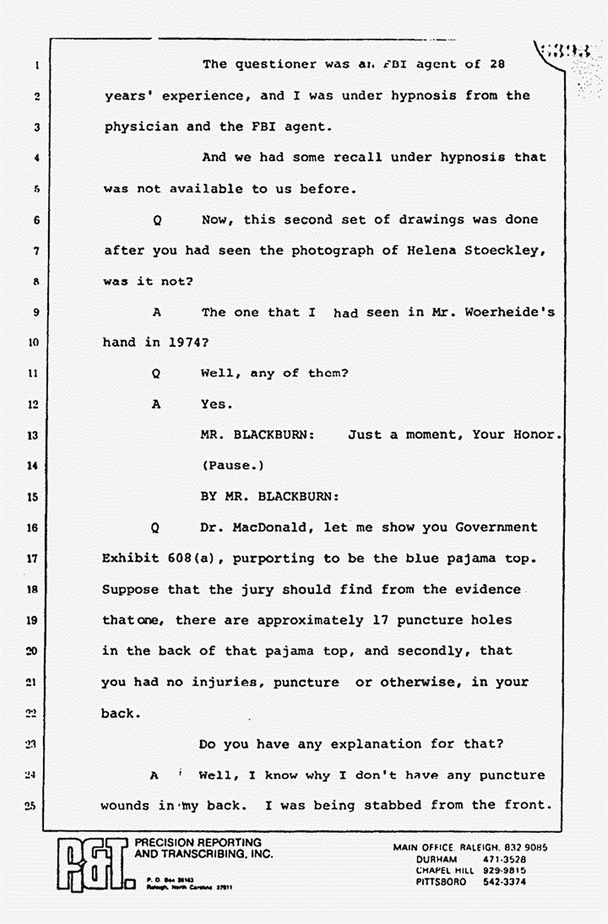 Q Dr. MacDonald, let me show you Government Exhibit 608(a), purporting to be the blue pajama top. Suppose that the jury should find from the evidence that one, there are approximately 17 puncture holes in the back of that pajama top, and secondly, that you had no injuries, puncture or otherwise, in your back.
