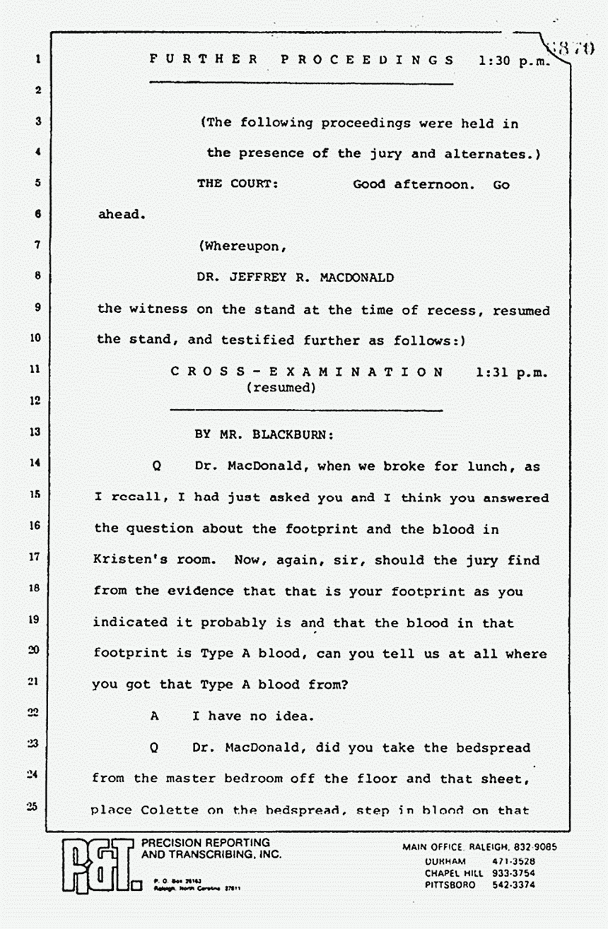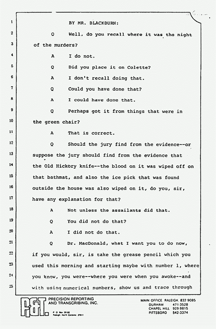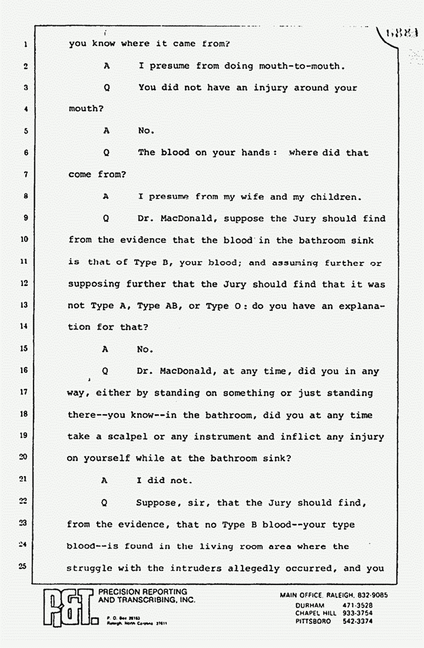 Q Dr. MacDonald, suppose the jury should find from the evidence that Type B blood, the same type as yours, is found in only one place on the blue pajama top belonging to you. Do you have any explanation for that, sir?
