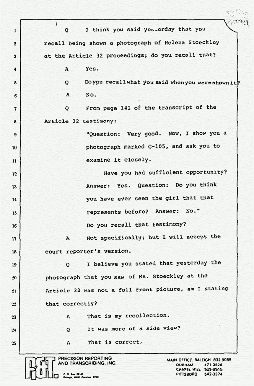 Q Were you or anyone working with you in the drawings -- the second set of drawings in 1979 -- given photographs of either Mr. Mazzarole, whom we have heard mentioned in court, or of Helena Stoeckley?