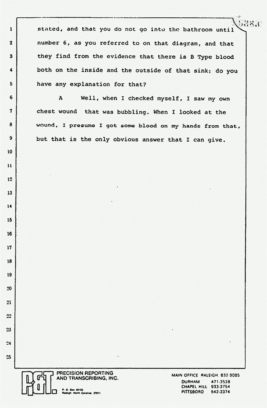 Q Suppose the Jury finds from the evidence that you were stabbed and the wounds weren't bleeding very much, and that you did not go into the bathroom until, say, number 6, as designated by you on that chart, and that B Type blood is found in the sink, on the outside of the sink and around the basin: do you have any explanation for that?
