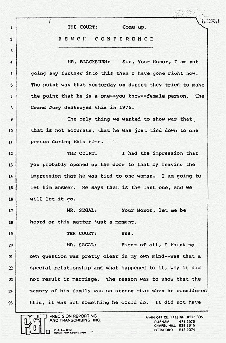 MR. BLACKBURN: Sir, Your Honor, I am not going any further into this than I have gone right now. The point was that yesterday on direct they tried to make the point that he is a one -- you know -- female person. The grand jury destroyed this in 1975.