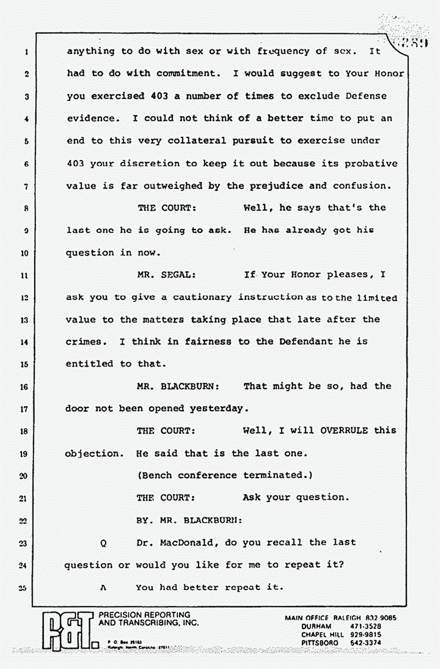 MR. SEGAL: First of all, I think my own question was pretty clear in my own mind -- was that a special relationship and what happened to it, why it did not result in marriage. The reason was to show that the memory of his family was so strong that when he considered this, it was not something he could do. It did not have anything to do with sex or with frequency of sex. It had to do with commitment. I would suggest to Your Honor you exercised 403 a number of times to exclude Defense evidence. I could not think of a better time to put an end to this very collateral pursuit to exercise under 403 your discretion to keep it out because its probative value is far outweighed by the prejudice and confusion.