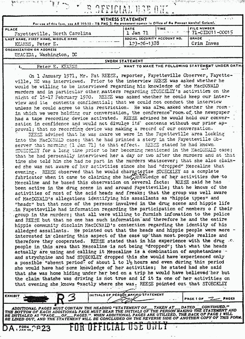 Statement of Peter Kearns re: Pat Reese and Helena Stoeckley