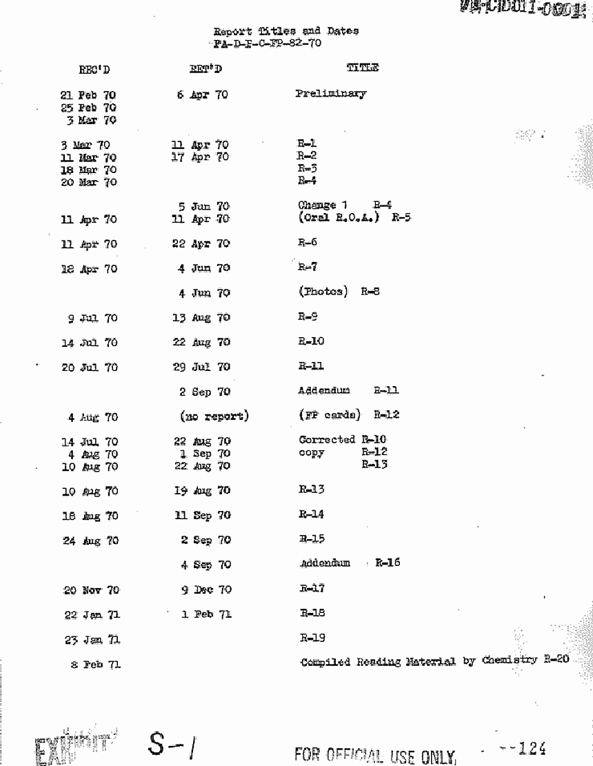 Titles and Dates re: reports received February 21, 1970 - February 8, 1971