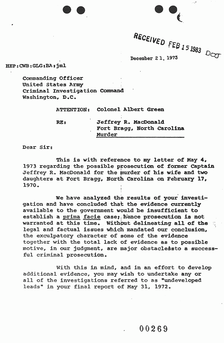 Letter from Assistant Attorney General Henry Petersen to Col. Albert Green, concluding that the evidence currently available to the government would be insufficient to establish