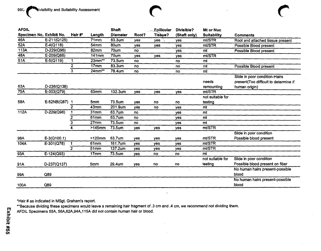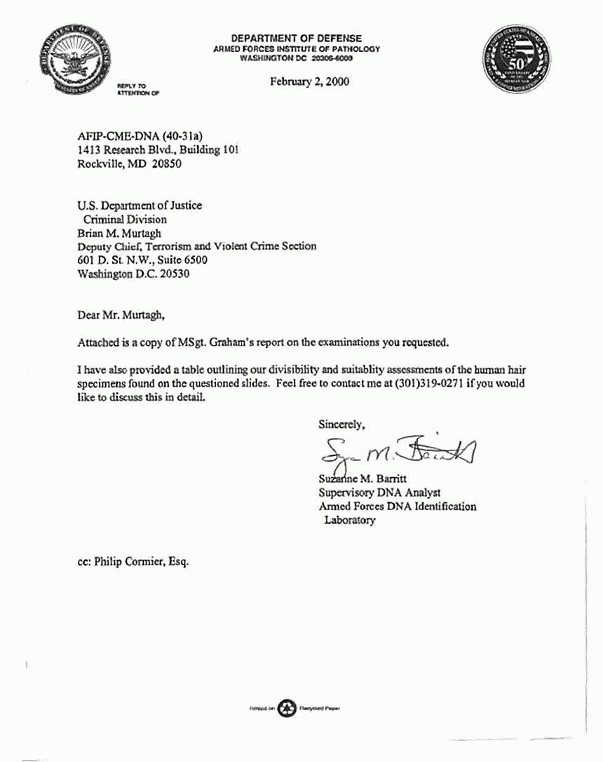 Letter from Suzanne Barritt (AFIP) to Brian Murtagh re: Report of Examinations by Grant Graham, with AFDIL Chart: "Divisibility and Suitability Assessment"