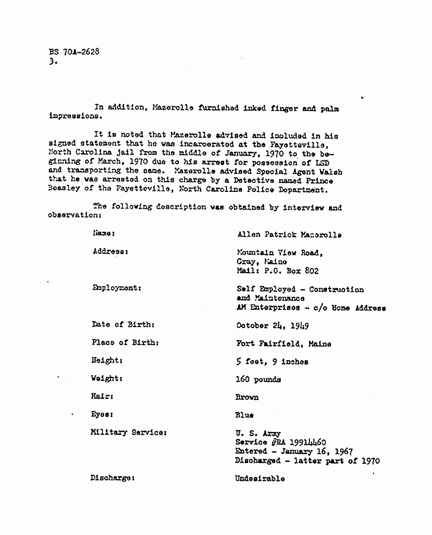 FBI File re: Nov. 17, 1981 interview of Allen Mazerolle