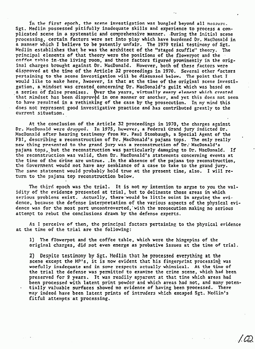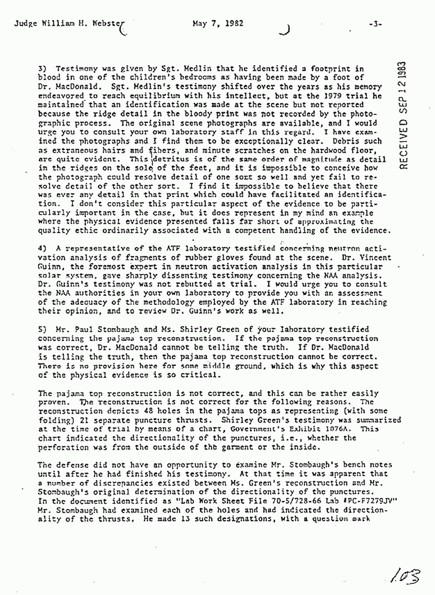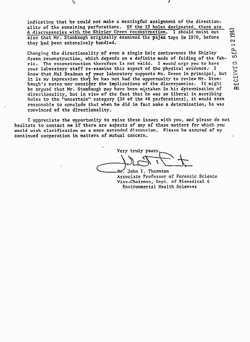 Letter from John Thornton to Judge William Webster (Director, FBI) re: Physical evidence examinations