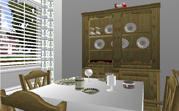 NOTE: The exact location of the Valentine's Day cards (shown here on top of china cabinet) was not known to this writer at the time these 3D views ere created. A photo shown on a WRAL broadcast in August 2012 shows that in fact, the cards were located on the buffet table near the china cabinet. The buffet (not shown here) is opposite the china cabinet, a few feet away from a table where Colette's clear-handled hairbrush was found.