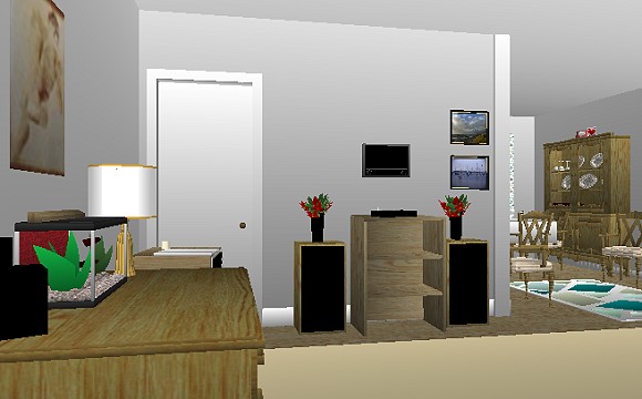 NOTE: The exact location of the Valentine's Day cards (shown here on top of china cabinet) was not known to this writer at the time these 3D views ere created. A photo shown on a WRAL broadcast in August 2012 shows that in fact, the cards were located on the buffet table near the china cabinet. The buffet (not shown here) is opposite the china cabinet, a few feet away from a table where Colette's clear-handled hairbrush was found.