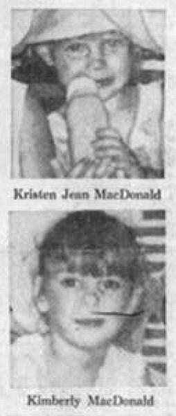Colette and Jeffrey MacDonald, 1958 and 1963 Colette (center, second row from top) and club members Colette MacDonald Kimberley MacDonald, born April 18, 1964 Kristen MacDonald, born May 8, 1967 Kristen MacDonald, born May 8, 1967 Kimberley MacDonald, ca. 1966 Kimberley MacDonald, ca. 1966 Kimberley MacDonald, ca. 1967 Circa 1967: Colette, Kimberley and Kristen MacDonald Circa 1968: Colette MacDonald Kimberley MacDonald, ca. 1968 Colette, Kimberley and Kristen MacDonald Kimberley MacDonald Kimberley and Kristen MacDonald Colette and Kristen MacDonald Kristen and Kimberley MacDonald Kristen MacDonald, ca. 1969 Kimberley and Kristen MacDonald at Halloween, 1969 1969: Colette and Kimberley MacDonald Circa 1969: Colette MacDonald painting shelves in daughter Kimberley's room 1969: Kristen MacDonald (left) and Kimberley MacDonald (right) 1970: Kimberley MacDonald, age 5.  A family photo distributed to jurors at Jeffrey MacDonald's 1979 trial.