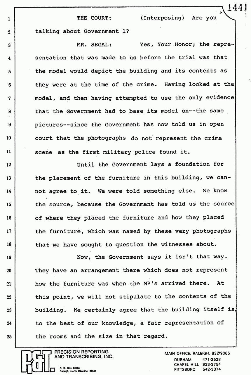MR. SEGAL: Yes, Your Honor; the representation that was made to us before the trial was that the model would depict the building and its contents as they were at the time of the crime. Having looked at the model, and then having attempted to use the only evidence that the Government had to base its model on -- the same pictures -- since the Government has now told us in open court that the photographs do not represent the crime scene as the first military police found it.
