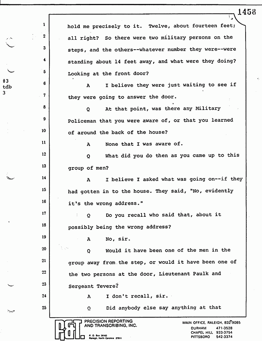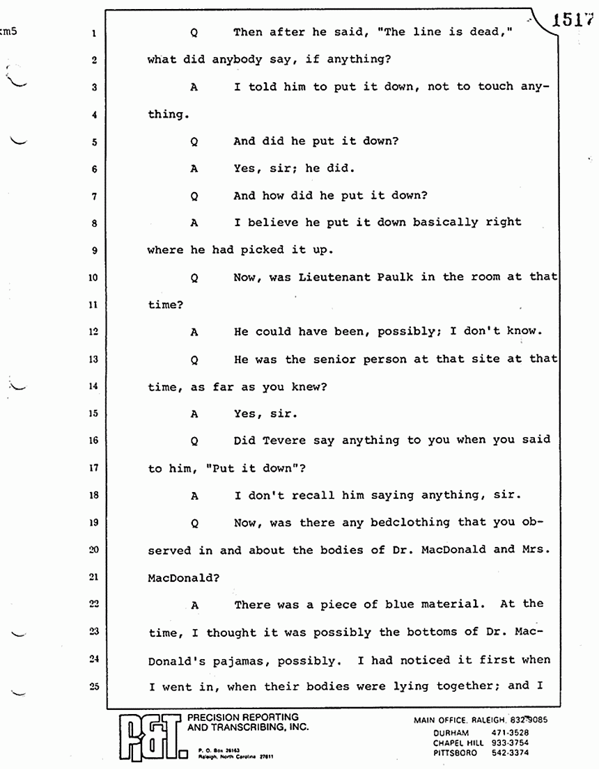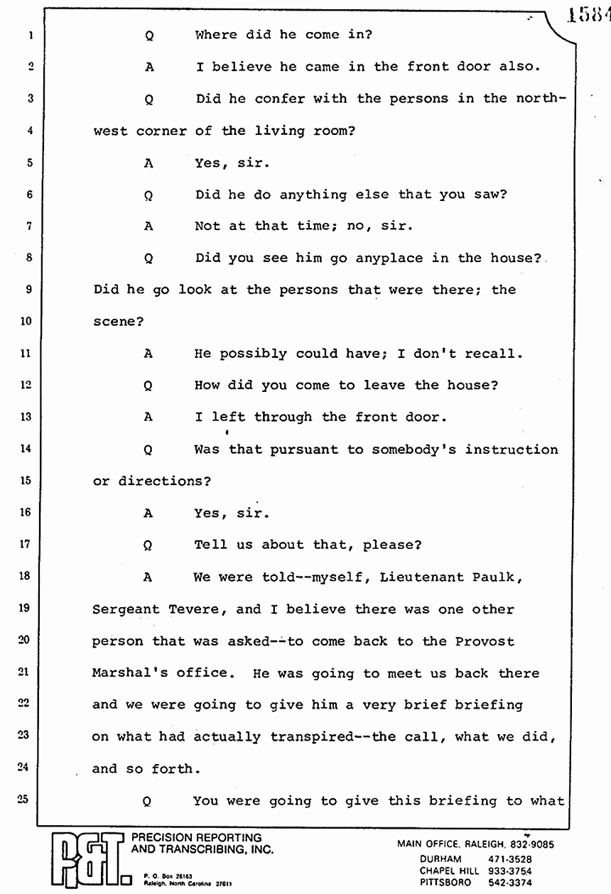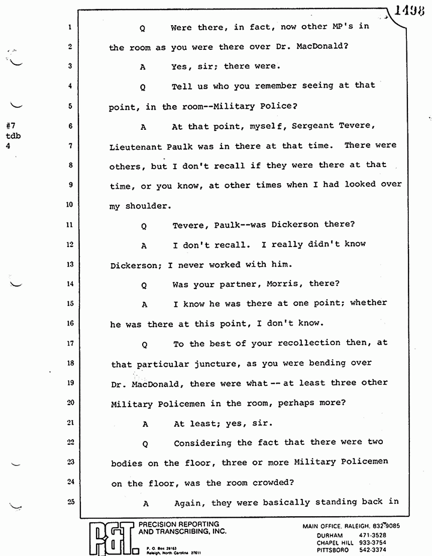 A As I was attending to Dr. MacDonald, when he had mentioned that there was possibly a girl involved, I turned my head over my shoulder -- I knew that Lieutenant Paulk was behind me, and I believe Tevere was still behind me -- I told him that I had seen a girl back on the corner of South Lucas and Honeycutt Road.