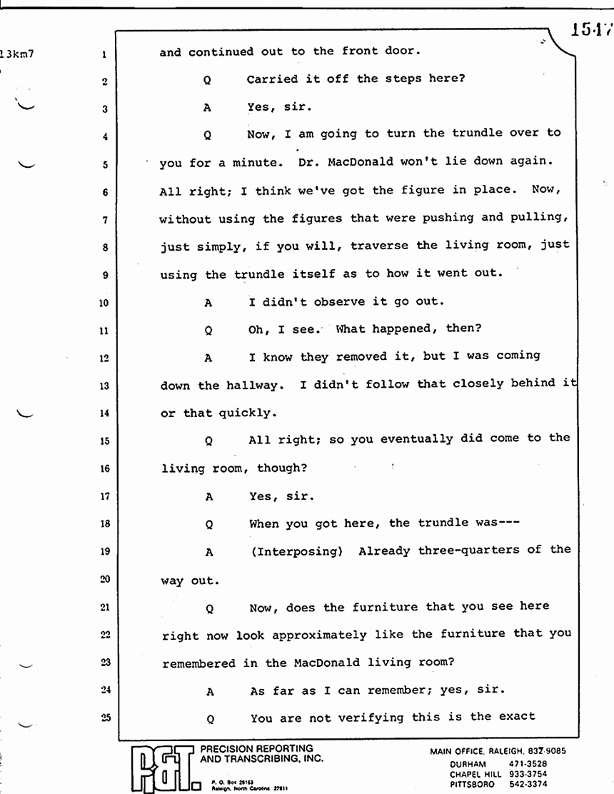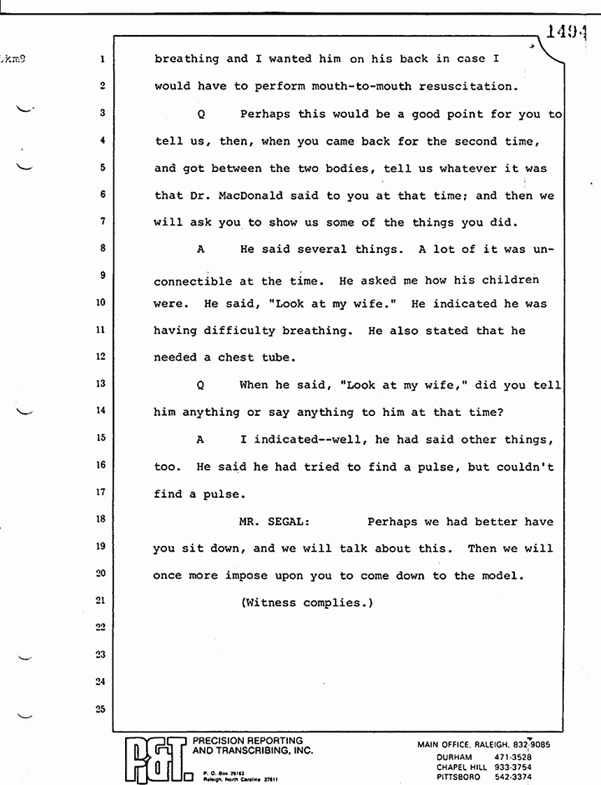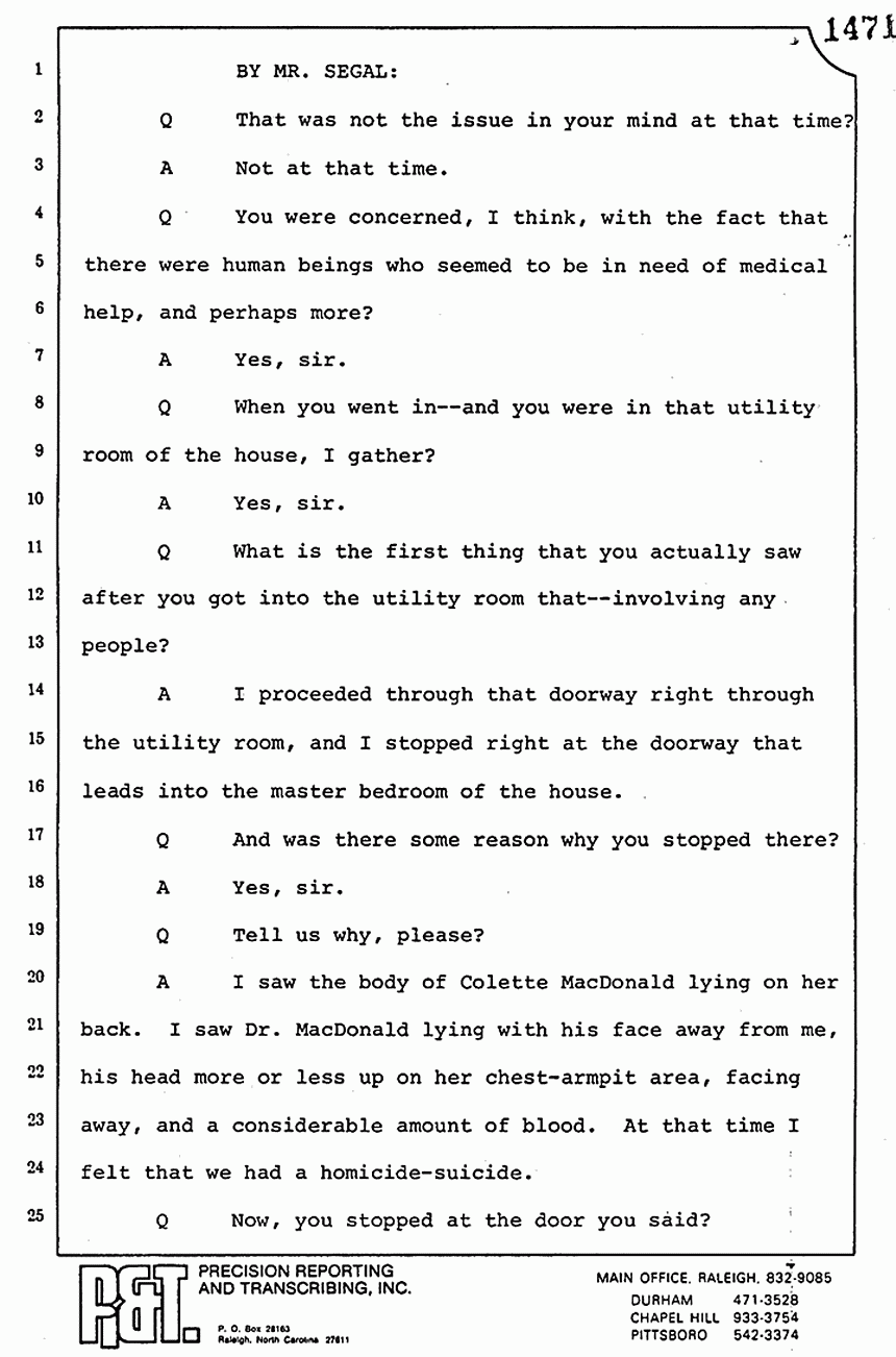 Q One last matter. When you turned to Lieutenant Paulk and Sergeant Tevere after having heard from Dr. MacDonald about the woman and making the connection in your mind, you said to them what?