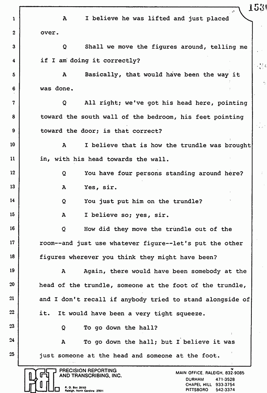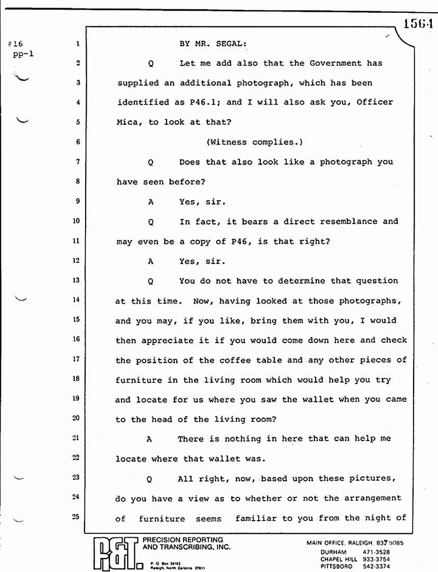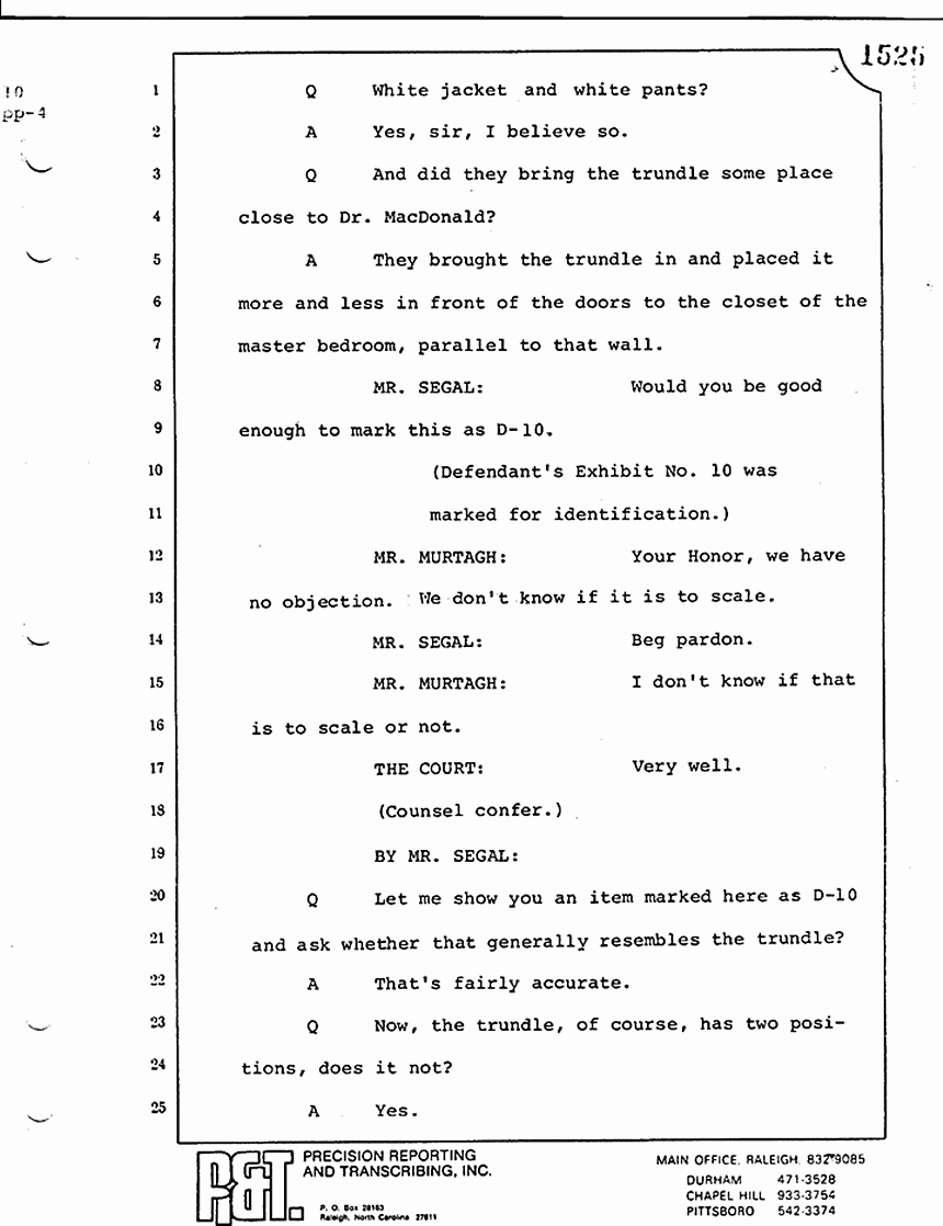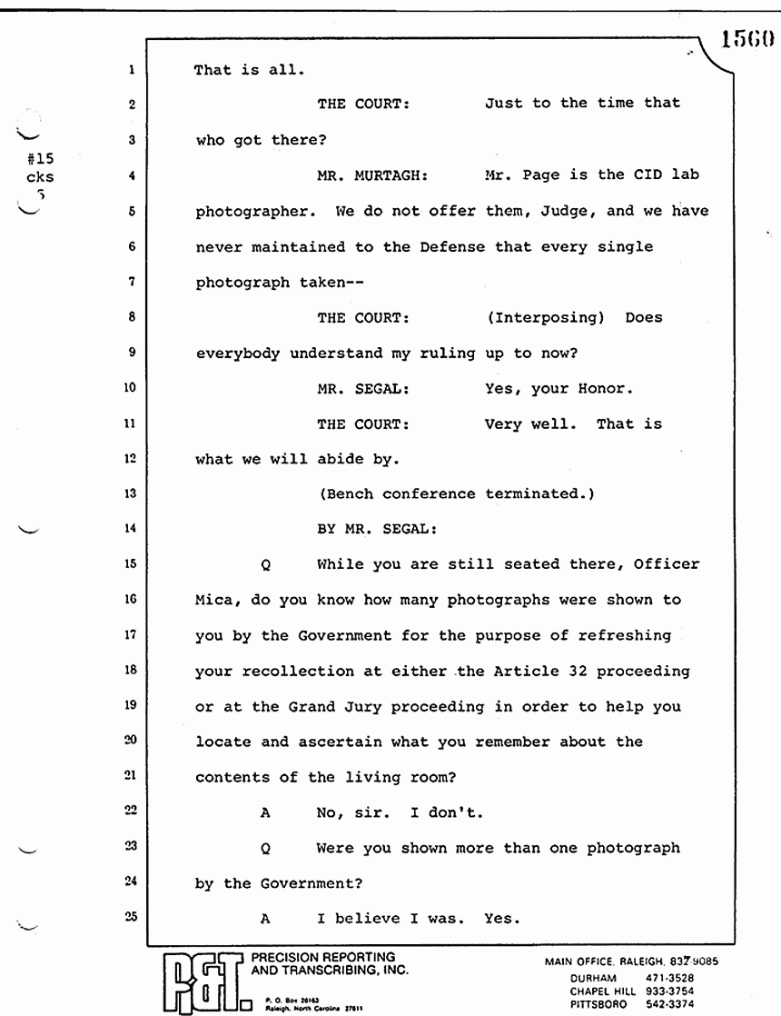 MR. MURTAGH: Your Honor, while we said that the furniture was an accurate scale model, and we do represent that some of it was made from the actual items that were still left in the crime scene -- and the rest of the photographs we used for approximate representations; but Your Honor is correct. It is the testimony of the witnesses that we are relying upon. Mr. Segal is again trying to use the photographs which the Government does not maintain are the best evidence of what the crime scene looked like -- the third set of photographs.