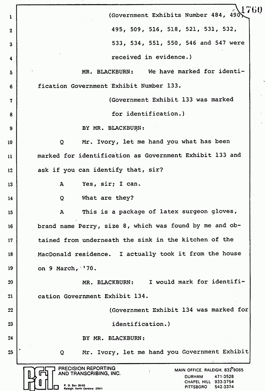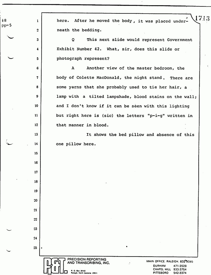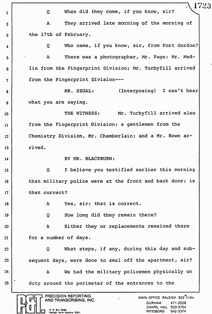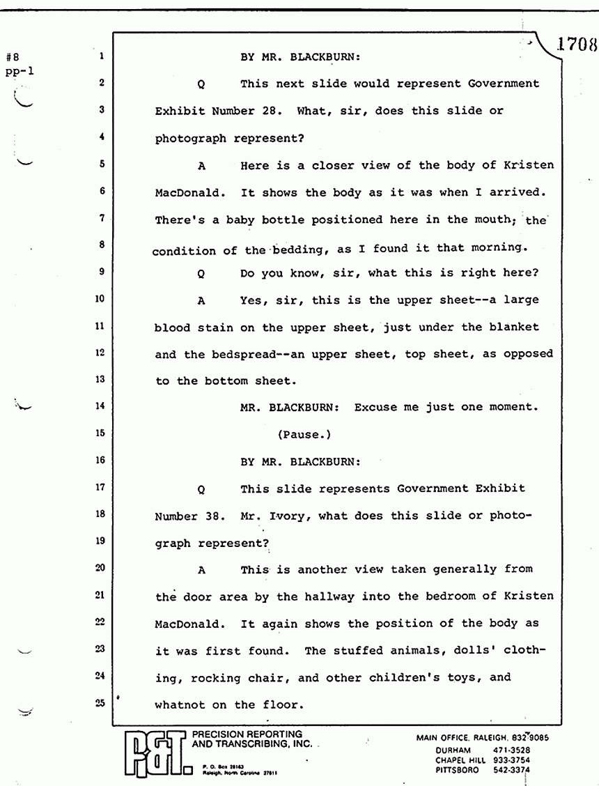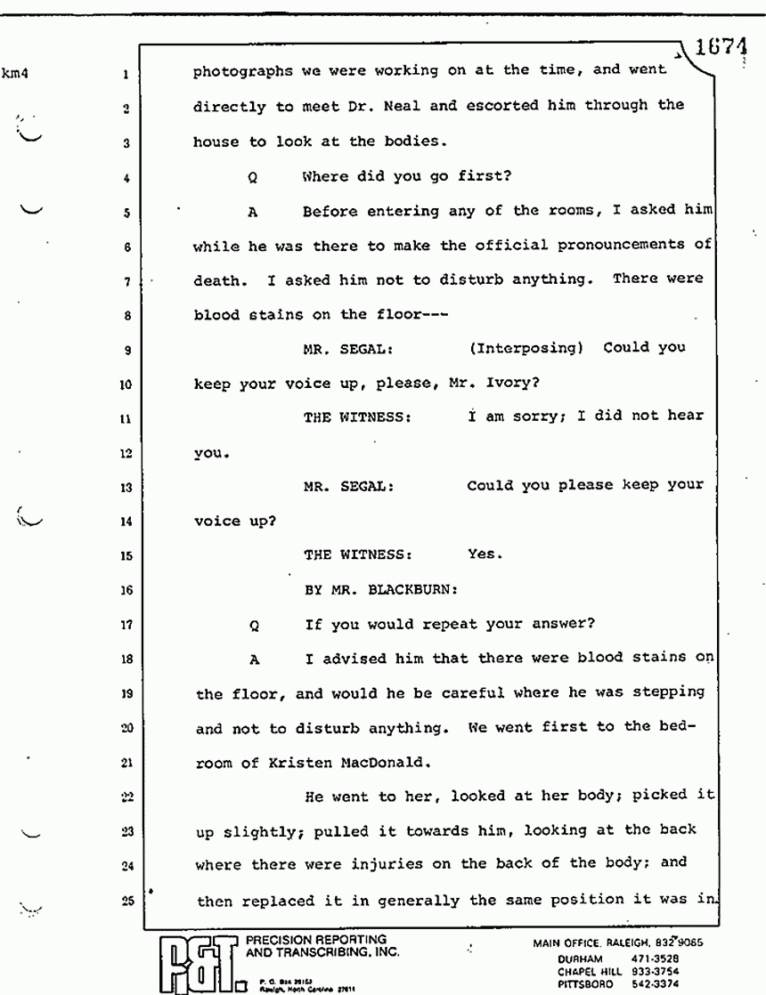 We moved then to the bedroom of Kimberly MacDonald. He went over to the side of the bed -- let me get my directions straight -- on the south side of the bed, viewed the body, reached across, touched the inside of the left wrist searching for a pulse. I saw him looking down into the injuries -- the head injuries and the throat injuries of the body -- and pronounced that body dead.
