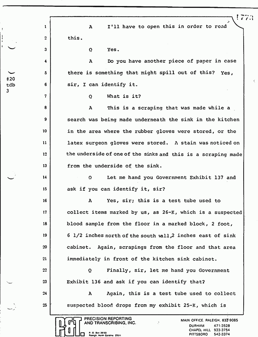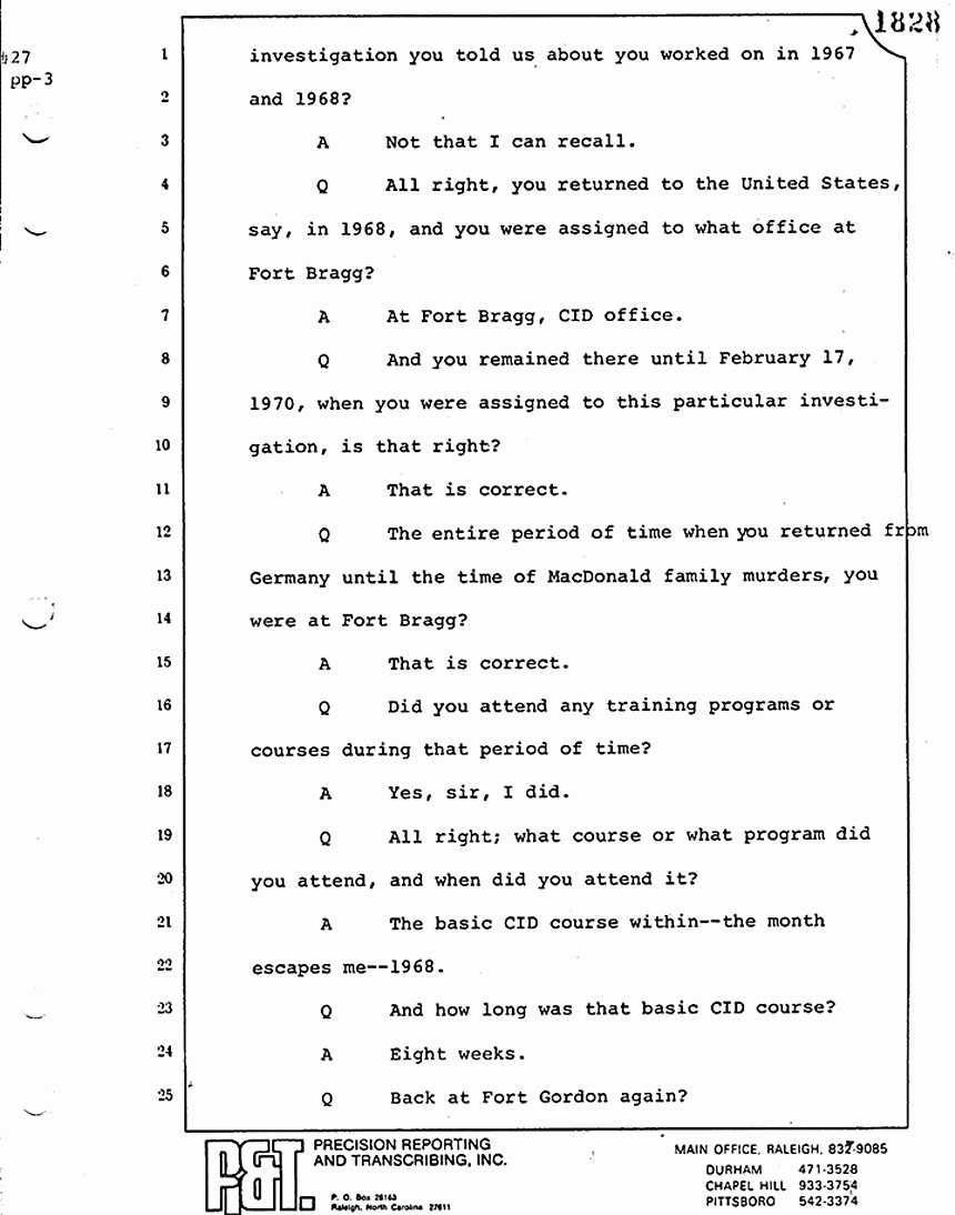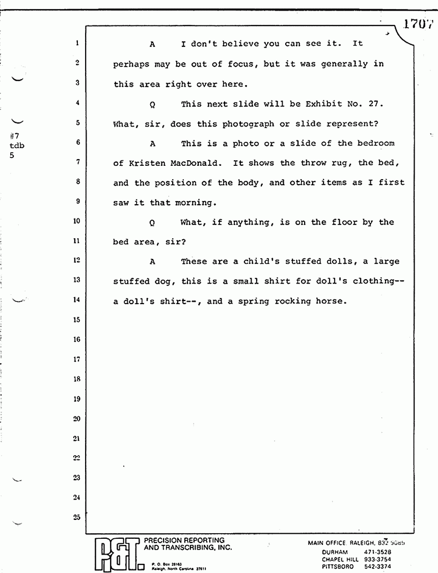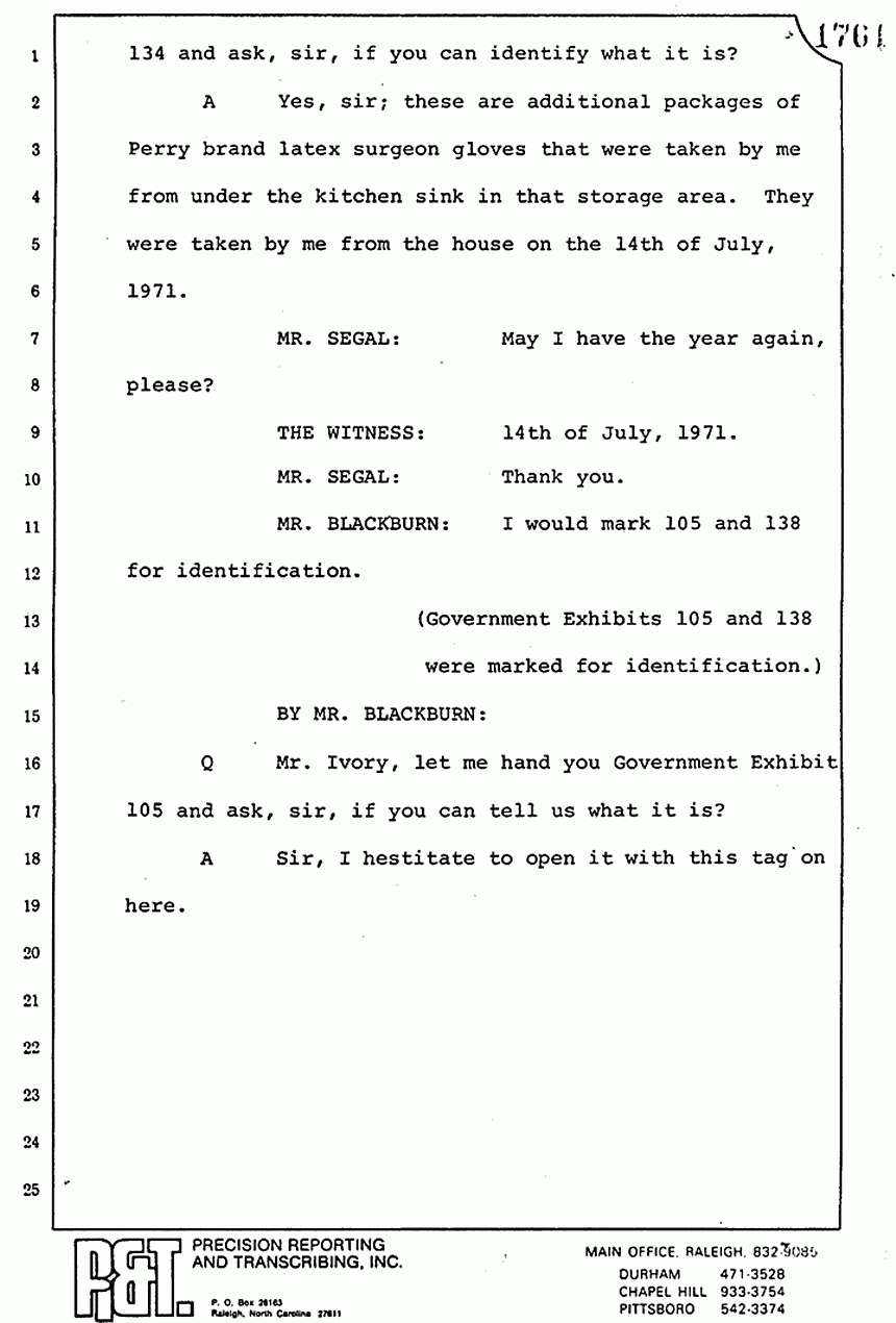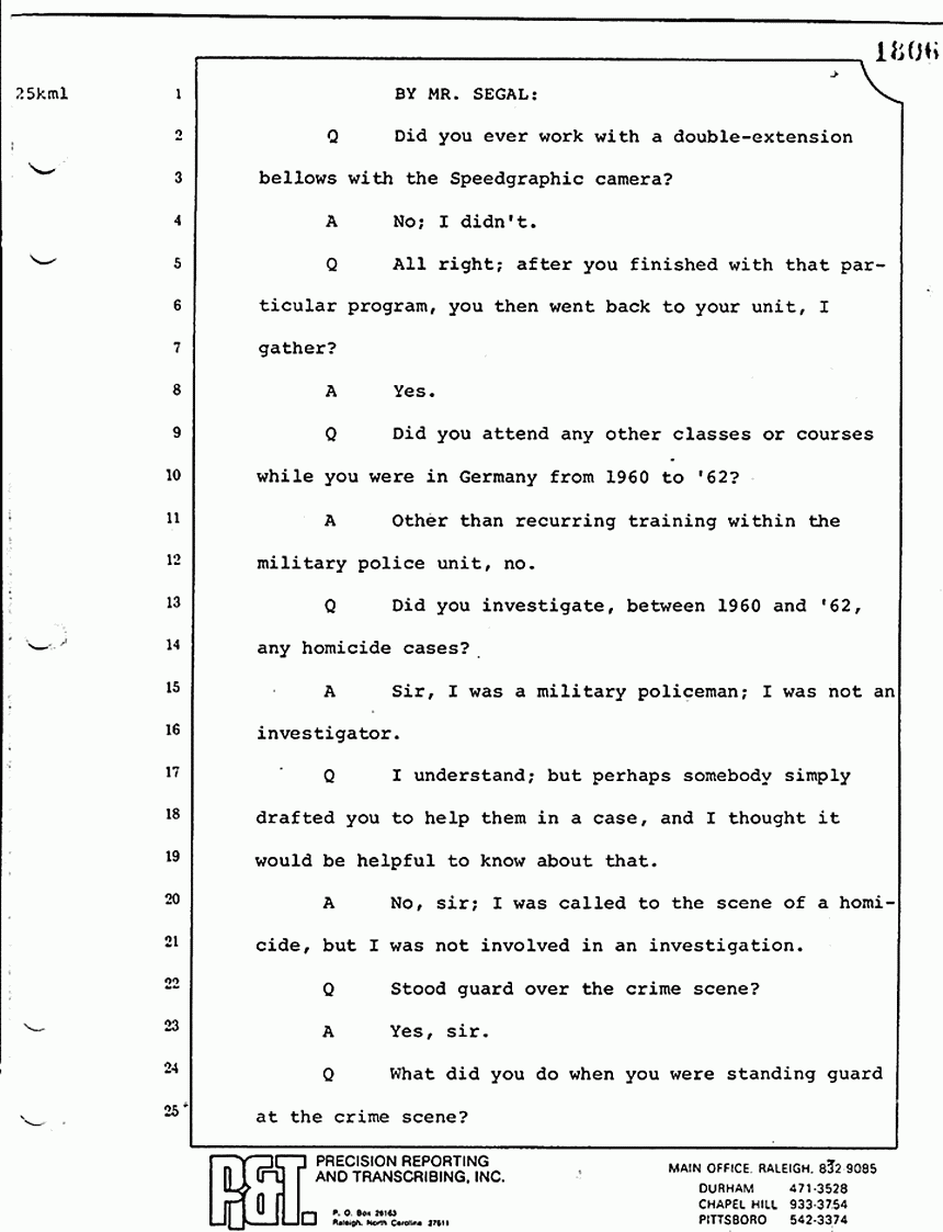 We moved then to the bedroom of Kimberly MacDonald. He went over to the side of the bed -- let me get my directions straight -- on the south side of the bed, viewed the body, reached across, touched the inside of the left wrist searching for a pulse. I saw him looking down into the injuries -- the head injuries and the throat injuries of the body -- and pronounced that body dead.