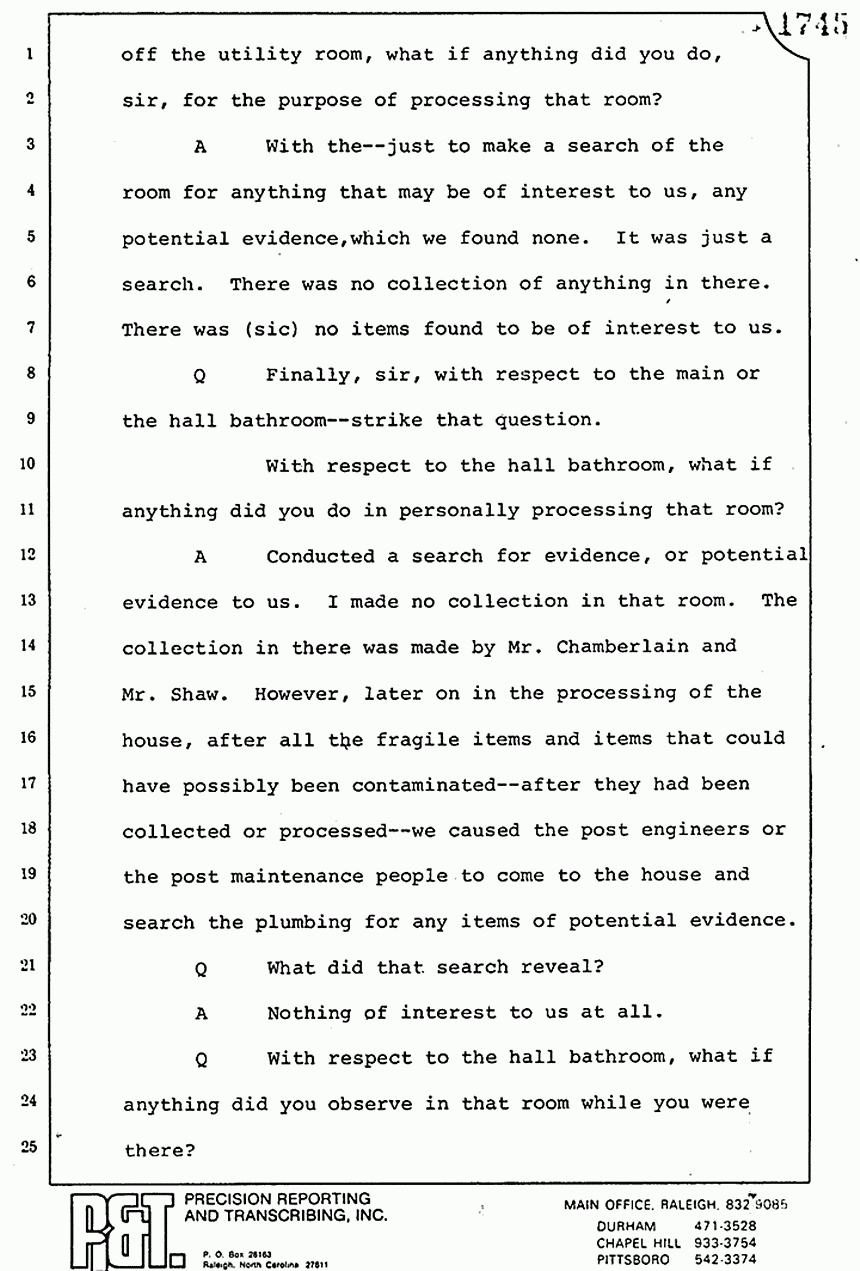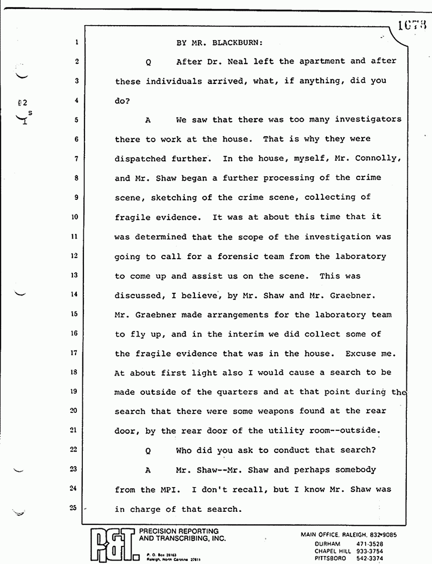 A We saw that there was too many investigators there to work at the house. That is why they were dispatched further. In the house, myself, Mr. Connolly, and Mr. Shaw began a further processing of the crime scene, sketching of the crime scene, collecting of fragile evidence. It was at about this time that it was determined that the scope of the investigation was going to call for a forensic team from the laboratory to come up and assist us on the scene. This was discussed, I believe, by Mr. Shaw and Mr. Grebner. Mr. Grebner made arrangements for the laboratory team to fly up, and in the interim we did collect some of the fragile evidence that was in the house. Excuse me. At about first light also I would cause a search to be made outside of the quarters and at that point during the search that there were some weapons found at the rear door, by the rear door of the utility room -- outside.