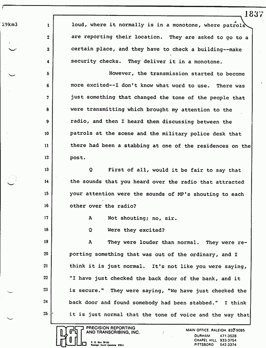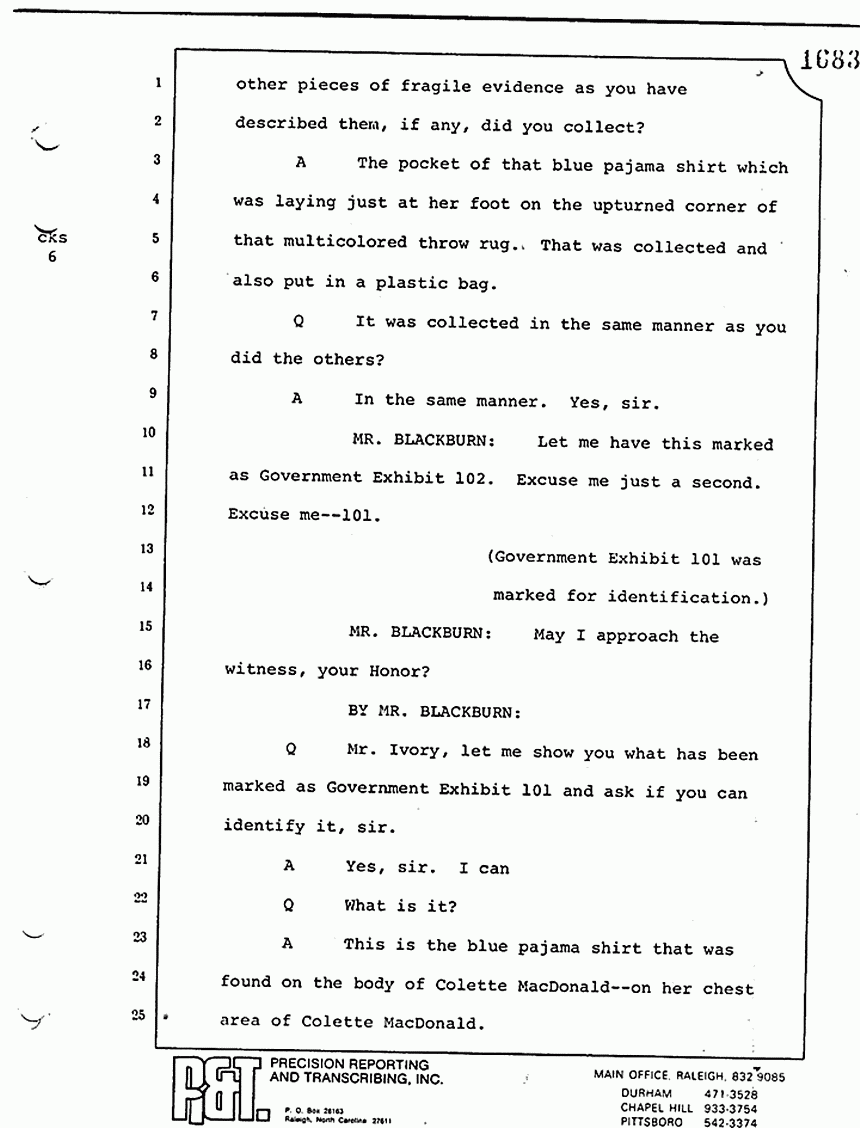 We went from there to the master bedroom to the body of Colette MacDonald, where he kind of -- he didn't kneel down, because his knees never really touched the floor -- but he kind of stooped down, if I could use that word, and looked at the body. One eye was open, and he reached and lifted the eyelid of the other eye; looked into it; touched the outstretched left arm at the wrist searching for a pulse; stood up and went around so he was standing in a position above the head and shoulders area of the body; again, kind of bent down; felt around the neck; didn't move the body -- nor did he move the body of Kimberly -- and made his announcement that Colette MacDonald was dead. Then he was escorted directly from the house.